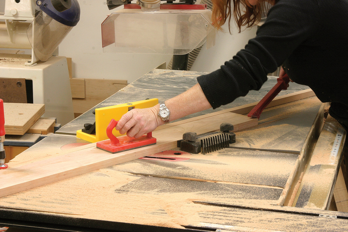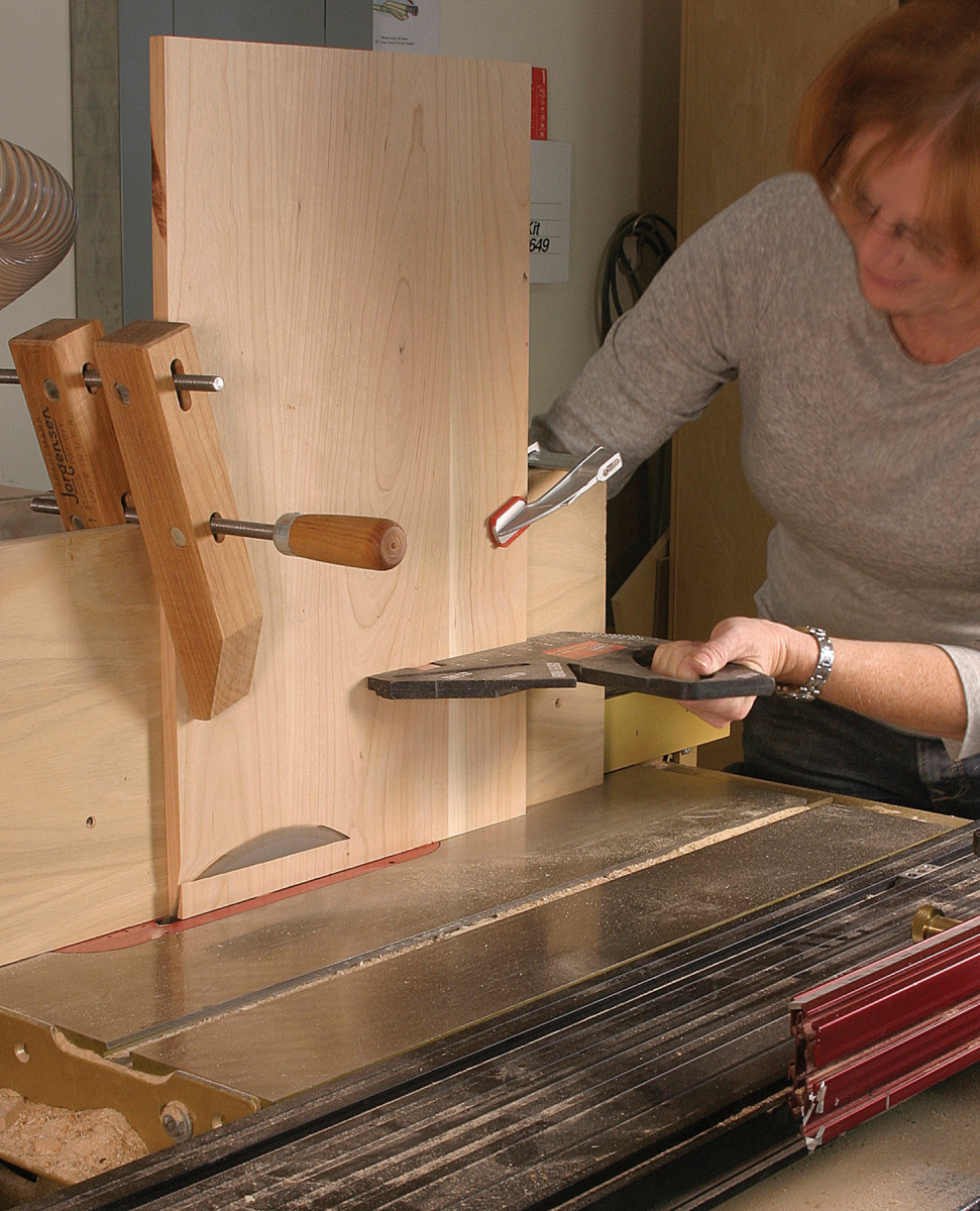Now, set up a fence-extension jig on your saw – a stable flat panel attached to your rip fence will work, but that jig will be stationary and you’ll have to carefully move your workpiece across the spinning blade. It’s safer to make a jig that fits over the fence and slides along it. That way, you can clamp the workpiece to the jig and move the unit instead.