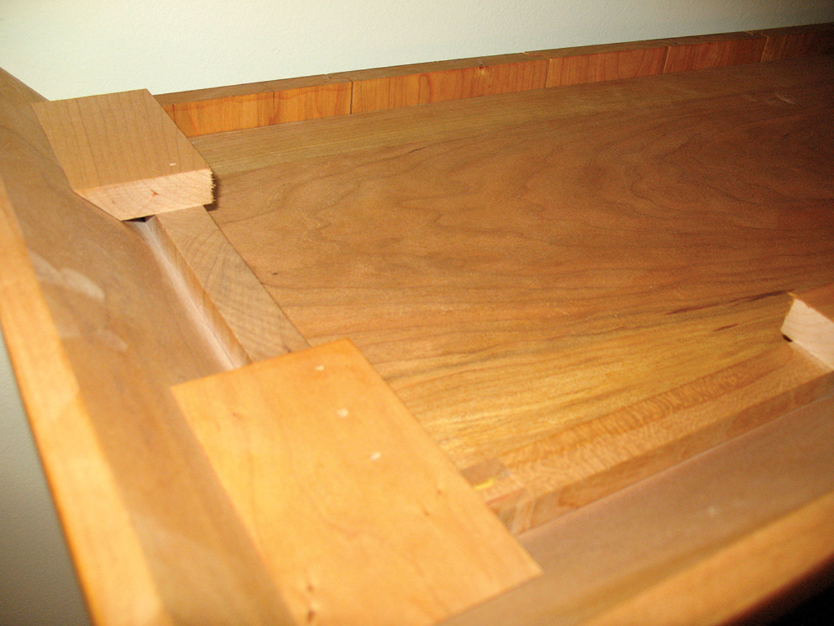 Buttoned down. The top of the bottom section is attached to the side and front rails with buttons. I used a biscuit joiner to cut two 1⁄2″-deep x 1-1⁄4″-wide slots on each side, and three along the front. I simply screwed through the back rail into the top’s bottom to secure it at the back.