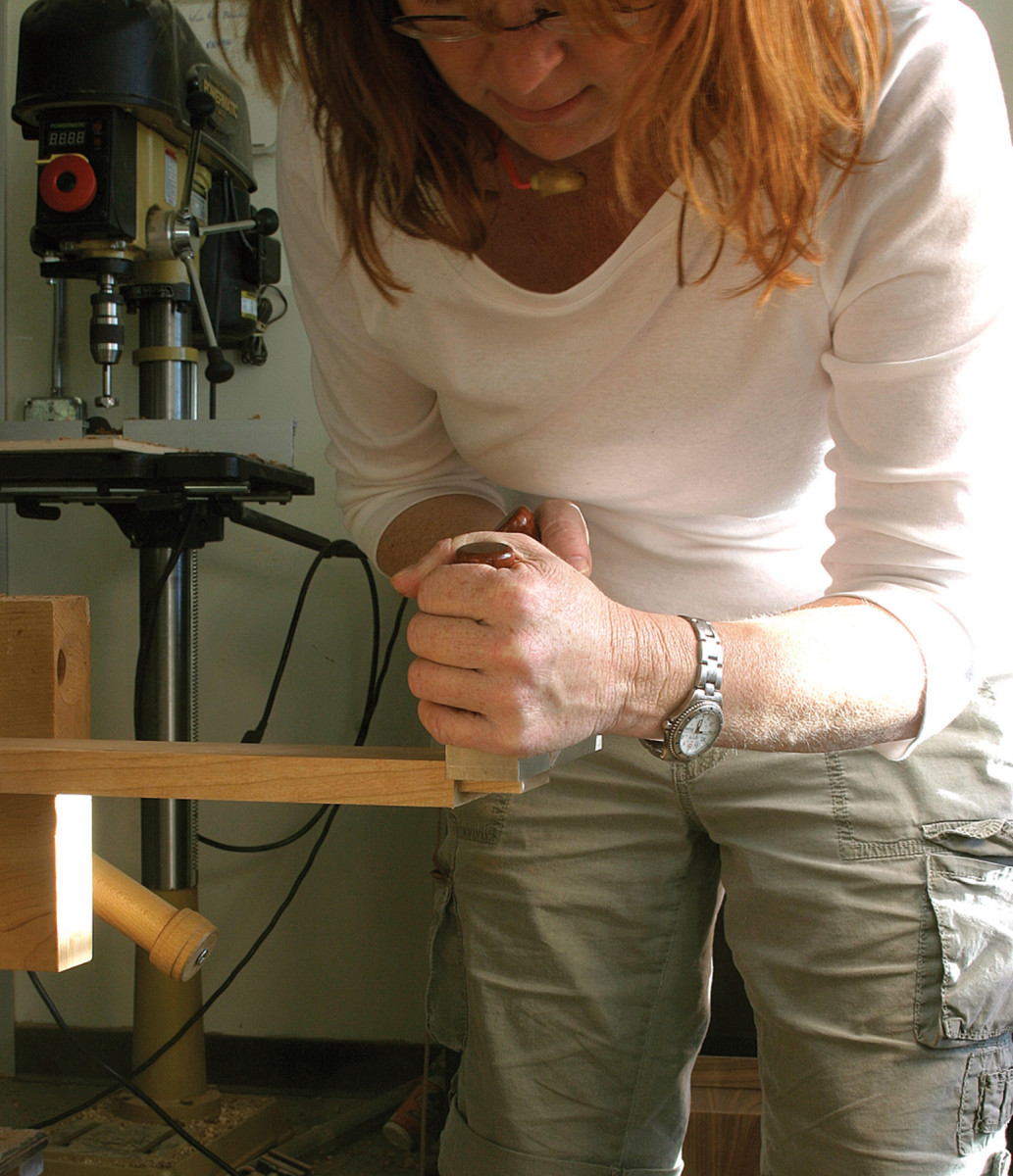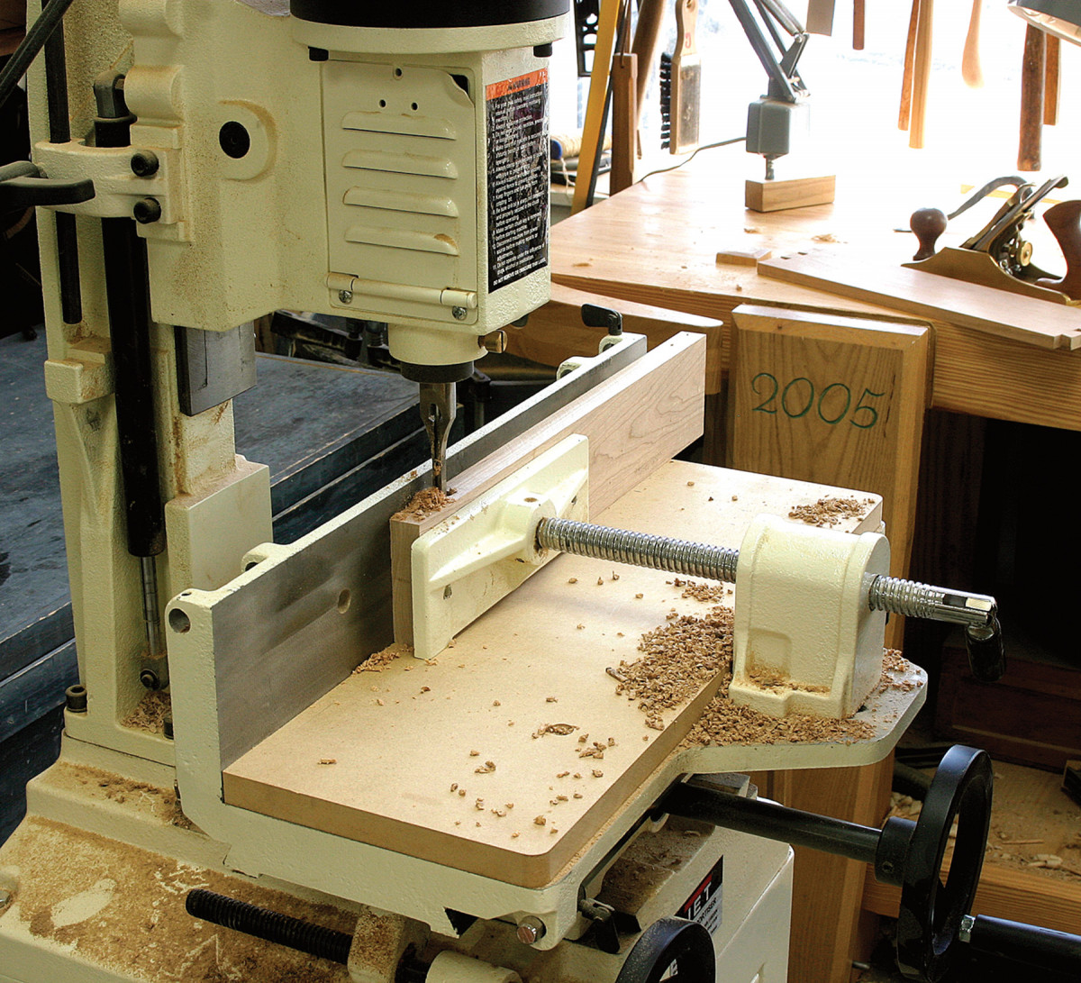 Many mortises. The majority of joints in this project are mortise and tenon. Take the time to set the hollow-chisel mortiser to cut dead-on centered mortises, 1-1⁄4″ deep – it will save you a lot of frustration and time later.