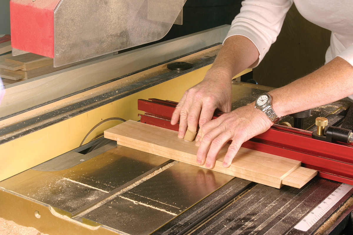 Cut across the grain first, at the top and bottom edges. Any tear-out will be cut away on your second two cuts, which are with the grain. Clamp your workpiece firmly to the fence extension and slide it smoothly across the blade. Now repeat until all six panels are raised, and sand away the mill marks. These panels will fit snug in the 3⁄8“-deep grooves, and allow for seasonal expansion and contraction. And if you prefer a more country look to a Shaker style? Face the raised panels to the outside of the piece and you’re there.
