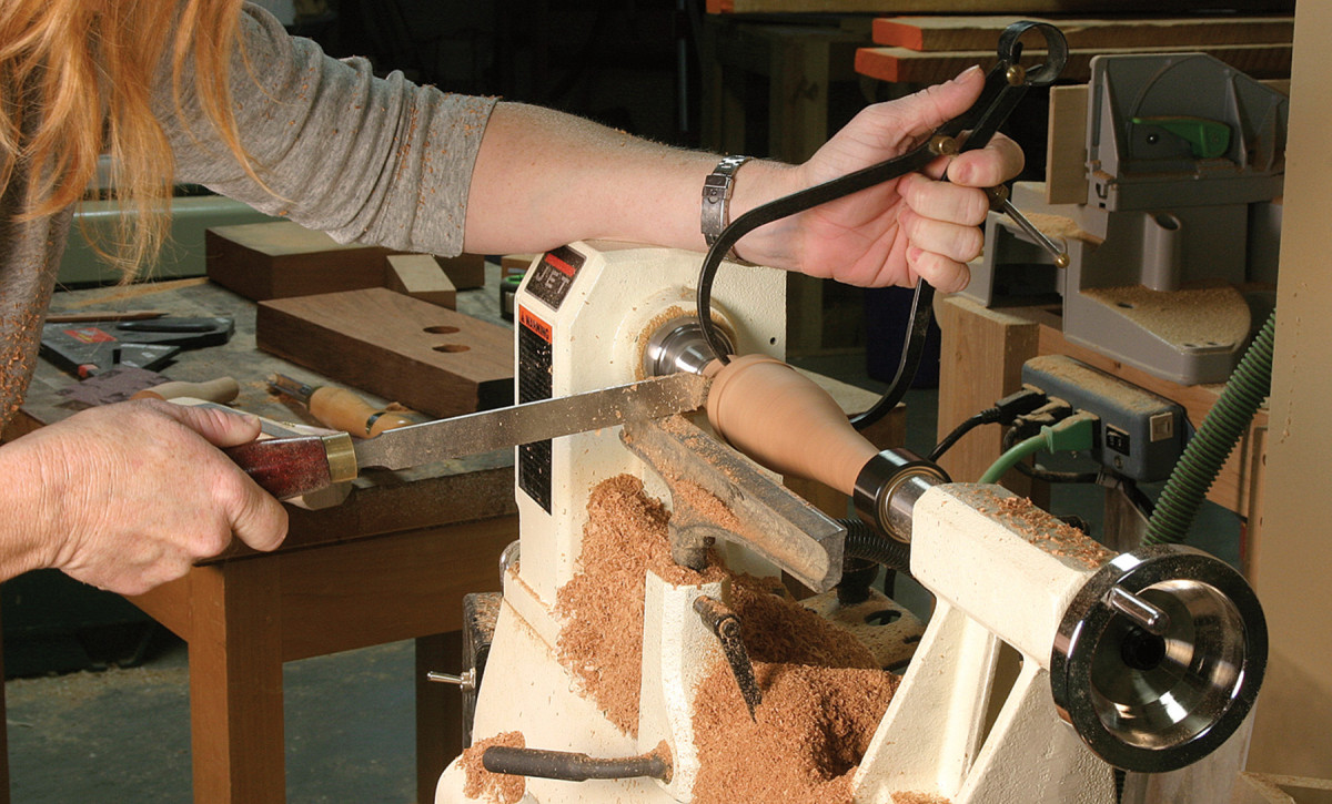 Even if each foot is slightly different (you can’t tell unless they’re right next to one another), be careful to turn the tenoned ends as close in size as possible. To achieve this, I set my calipers to 3⁄4” and held them against the tenon as I cut the waste away with a wide parting tool. As soon as I reached a 3⁄4” diameter, the calipers slid over the piece. I then turned the rest of the tenon to match.