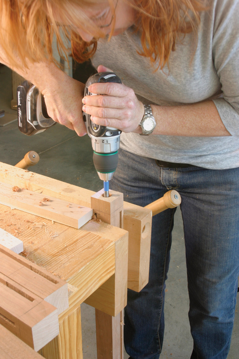 I clamped each leg perpendicular to the floor, and drilled 3⁄4“-diameter x 1-1⁄4“-deep holes centered in the bottom of each leg. Be careful to keep your drill straight (or set up a drill press for greater accuracy). With the holes drilled, I set the feet aside until the rest of the bottom carcase was done.