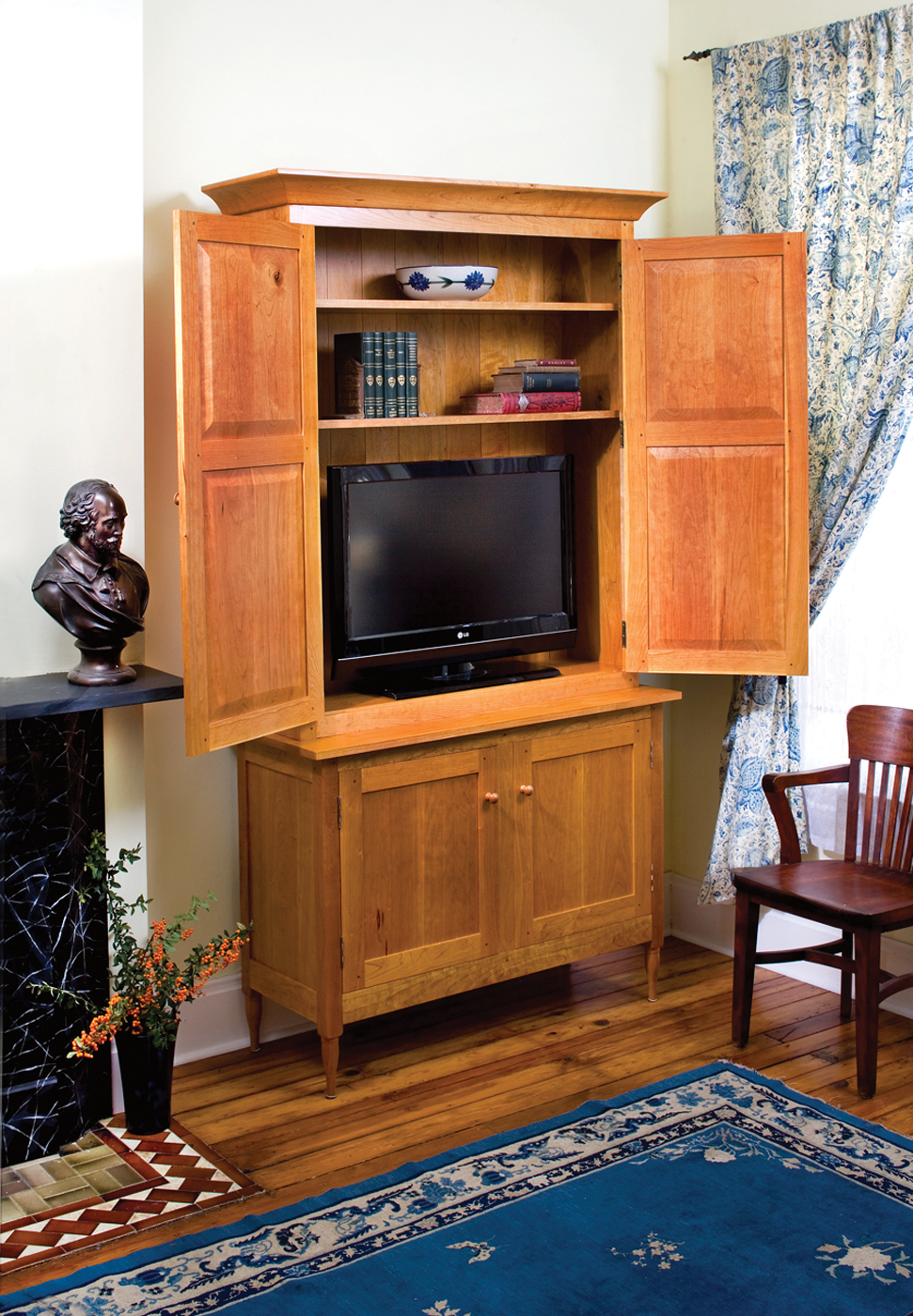 So, I flipped through a pile of books on Shaker furniture and auction-house catalogs to cull design ideas for a stepback cupboard that could be repurposed as a modern entertainment center that would not only allow me to hide a 32″ flat-panel TV behind doors, but also house the cable box, DVD player and various stereo components. (Of course, if you want to use it in your dining room, just omit all the holes in the backboards for air flow and cord management.)