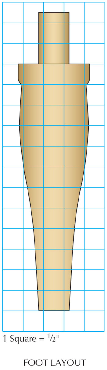 At some point before you do any glue up, you’ll want to turn your feet at the lathe and create a tenon at the end to join to the leg. (Of course, you could also add 6″ to your leg length, and turn the foot on the leg stock. However, I decided I’d rather muck up a 6″ length of wood than a 34″ piece, so I made the feet as separate pieces.) I first milled each foot blank square, then turned them round and shaped each foot, following the pattern above.