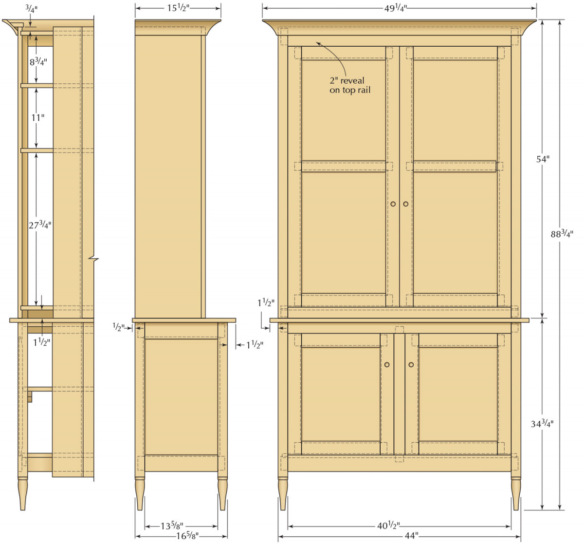 Unless you have access to a lot of wide stock, you’ll also need to glue up 3⁄4“-thick panels for the upper carcase sides, top, bottom and shelves, and the lower carcase bottom, shelf and top.
