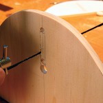 Now deal with the back. Cut the ogee shapes on the top of the back piece. Then cut the slot that allows you to hang this cupboard on a peg or nail. Here’s how. Drill a 1⁄4″ hole at the top of the slot. Drill a 3⁄8″ hole at the bottom. Connect the two slots using a coping saw. Attach the back to the carcase using 2d clout nails (no glue).