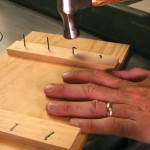 When all the nails are driven in, turn the assembled door over onto a metal surface and hammer the tips of the nails. This will bend them over into the wood, securing them. Then cut the hinge gains, hang the door and make a turn to hold the door closed. The original also had a little knob, which is best turned on a lathe.