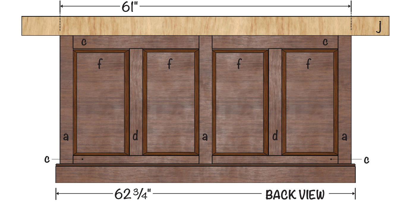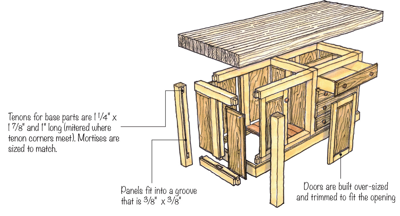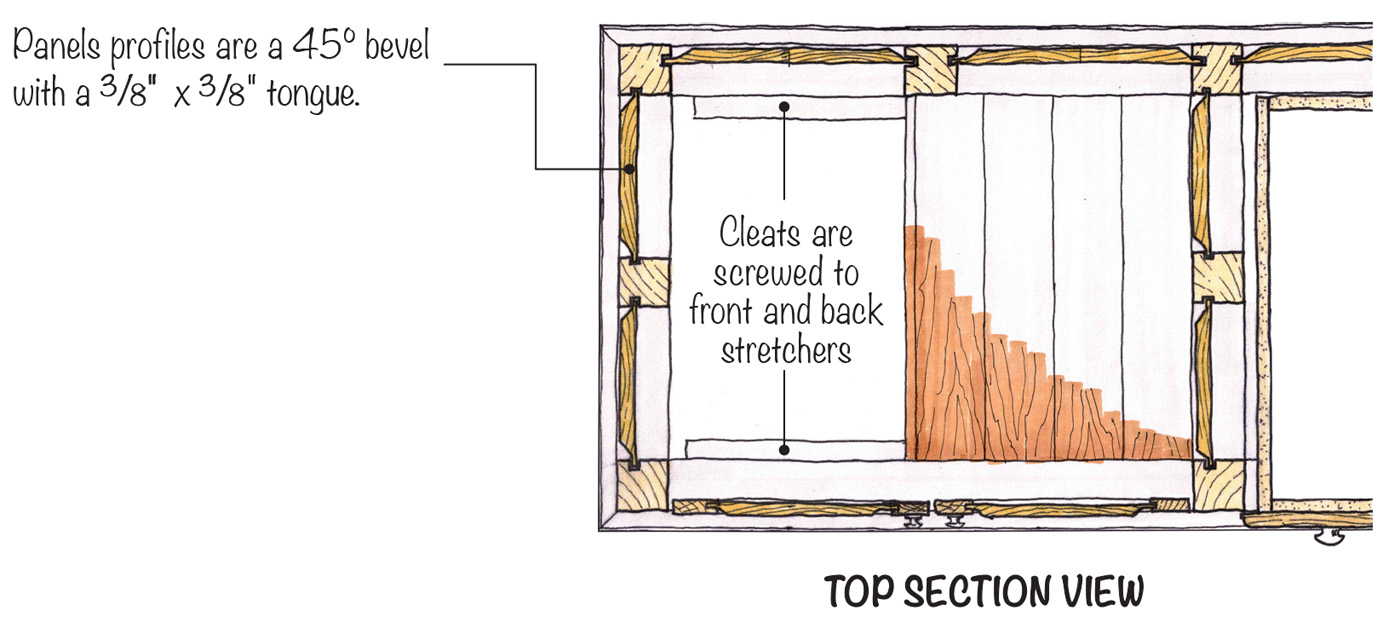The open bay is enclosed with frame and panel doors inset into the openings. The door frames are joined with pegged mortises and tenons. The rails and stiles are made with 11/8“ thick stock to accommodate the 15/16“ thick panel with the same 45° raised-panel bevel as on the rest of the bench.