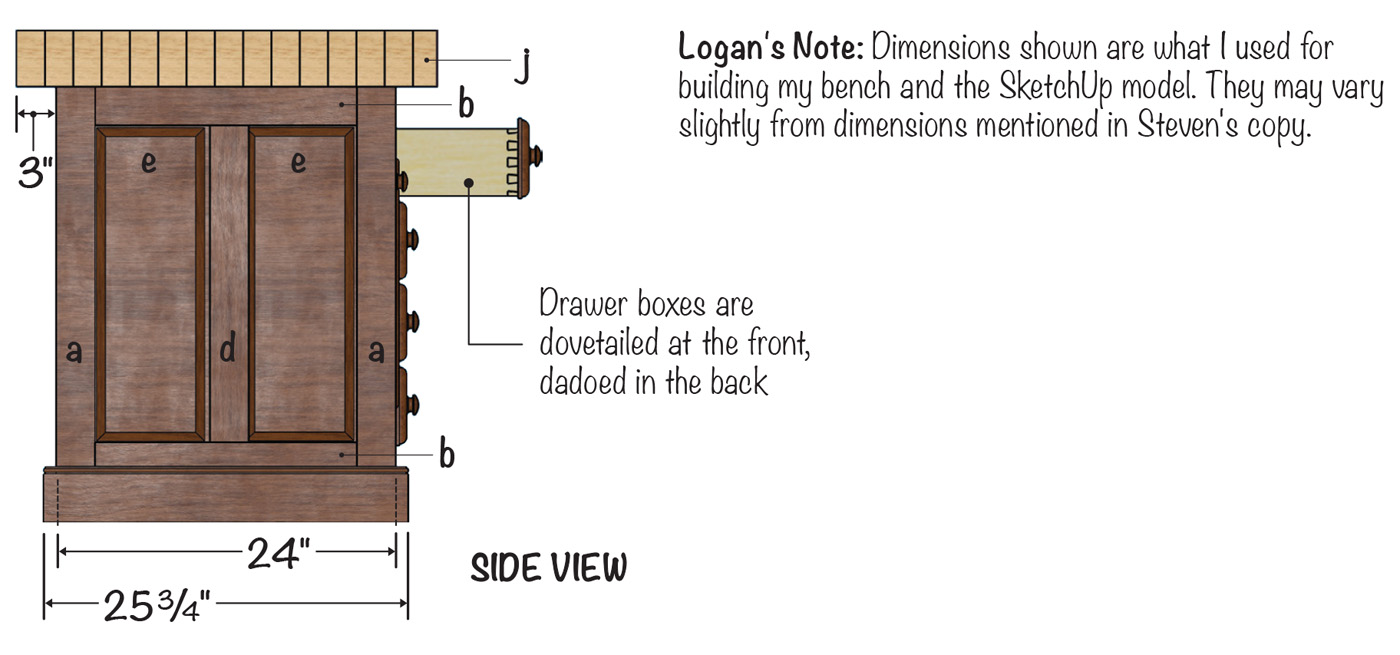 As I mentioned before, Steven’s bench shown here fit everything I wanted for a bench for my shop. However, upon starting construction, I found it interesting, as I was using different methods than the author described (exactly as I expect our readers to do with each project — gather the basics, then build it how suits you in your shop).