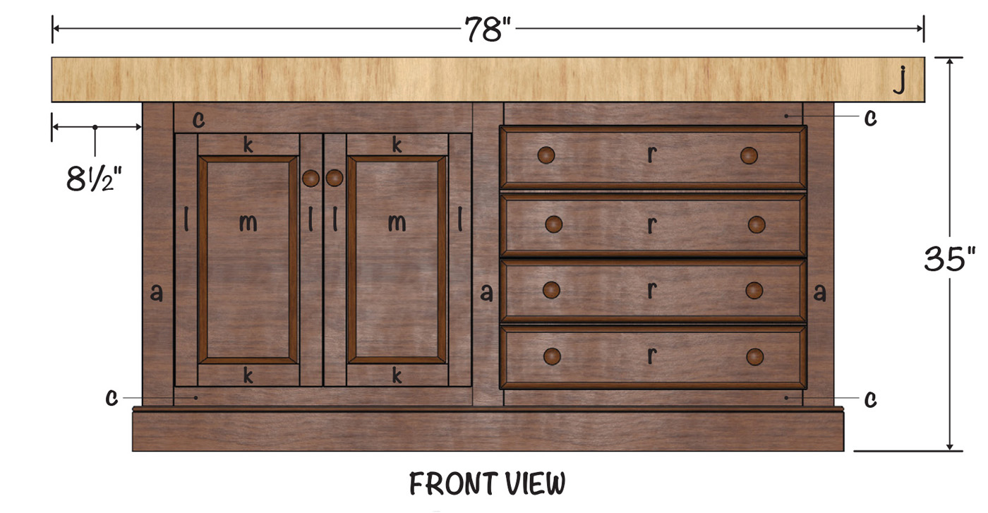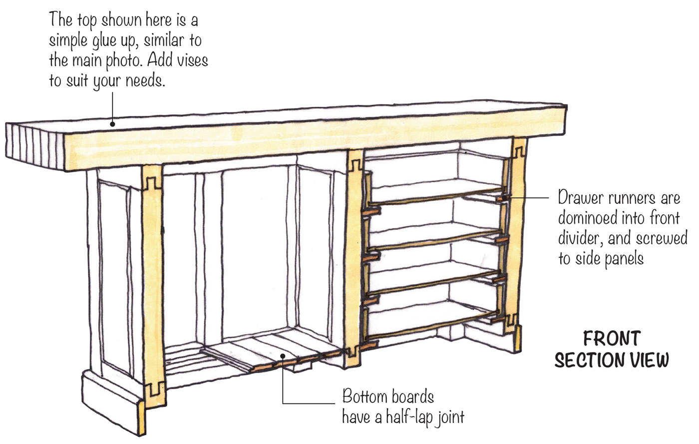 The basic frame can be modified to accept varying combinations of drawers or doors. Want a bench with all drawers, or doors? Want doors on one side of the bench, and drawers on the opposite side? Want double fronted drawers that can be pulled open from either side of the bench? Any of these arrangements can be fitted within the basic frame of the bench I built.