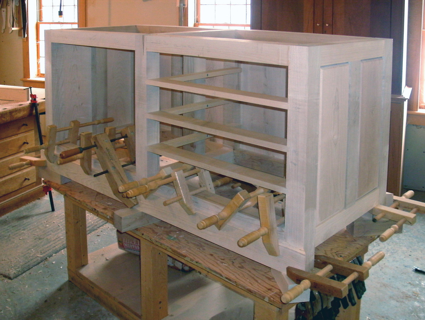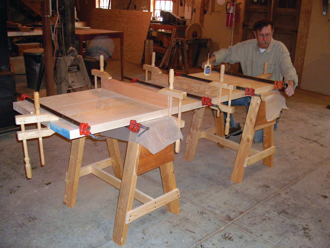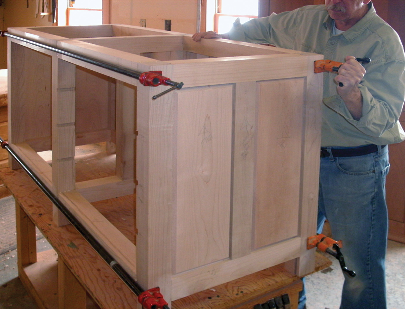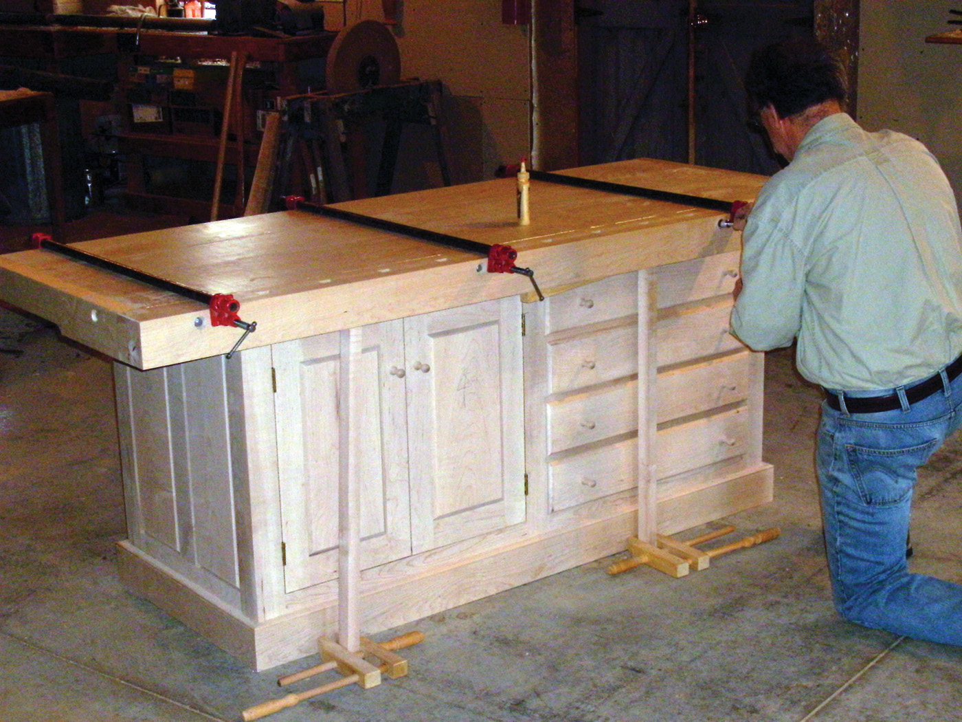 16 The benchtop is glued up from several boards, with cauls to keep it flat.