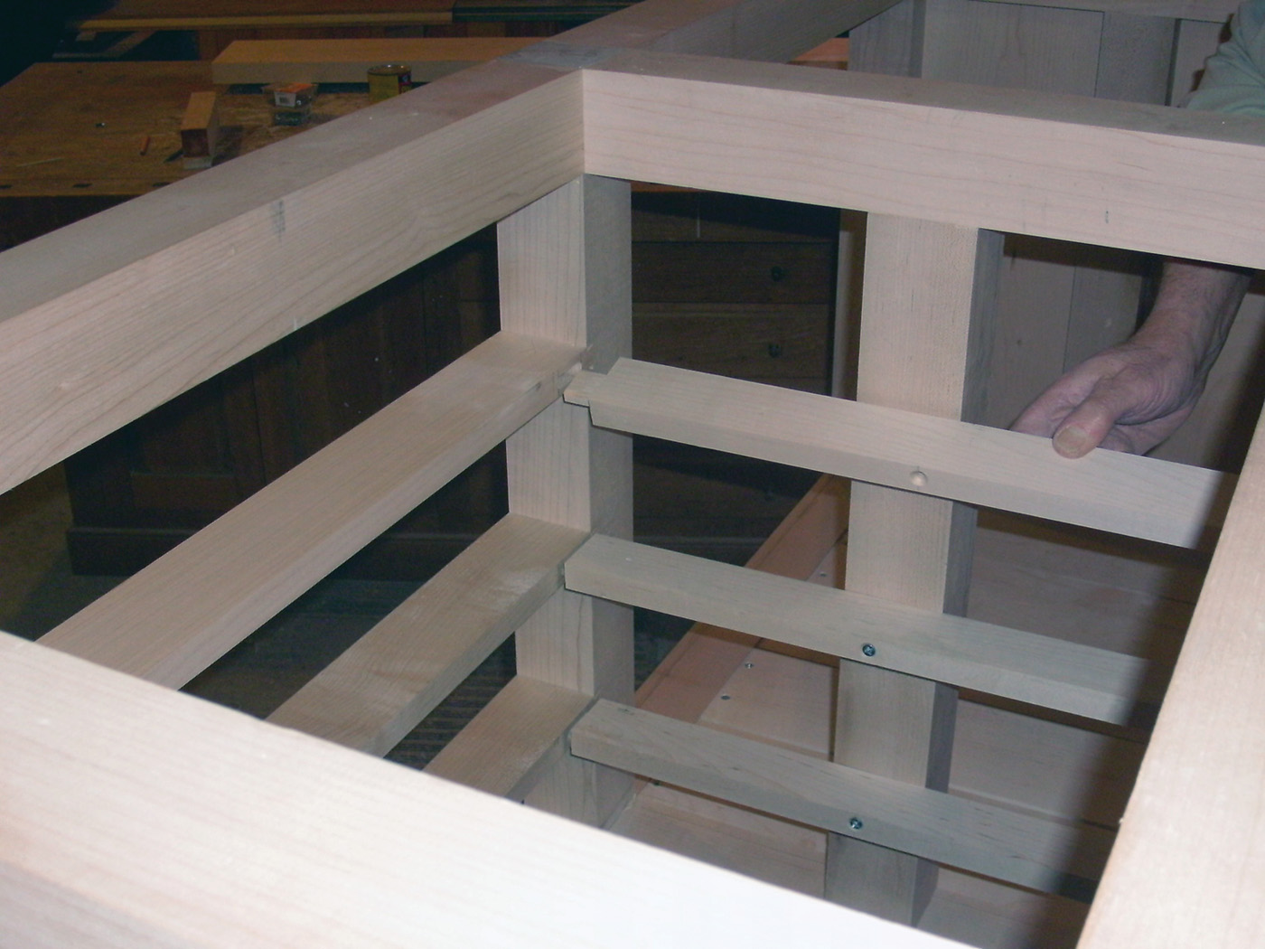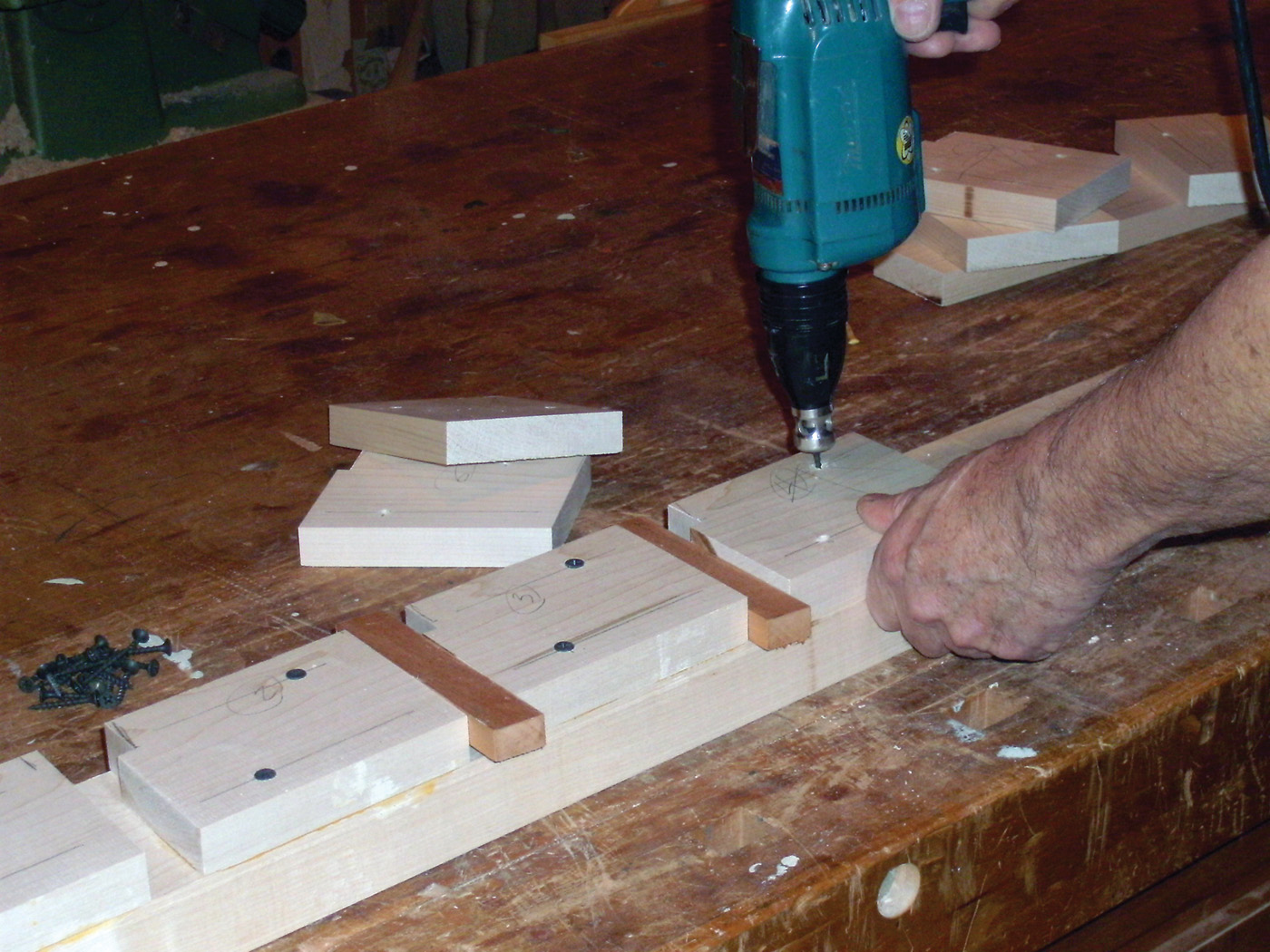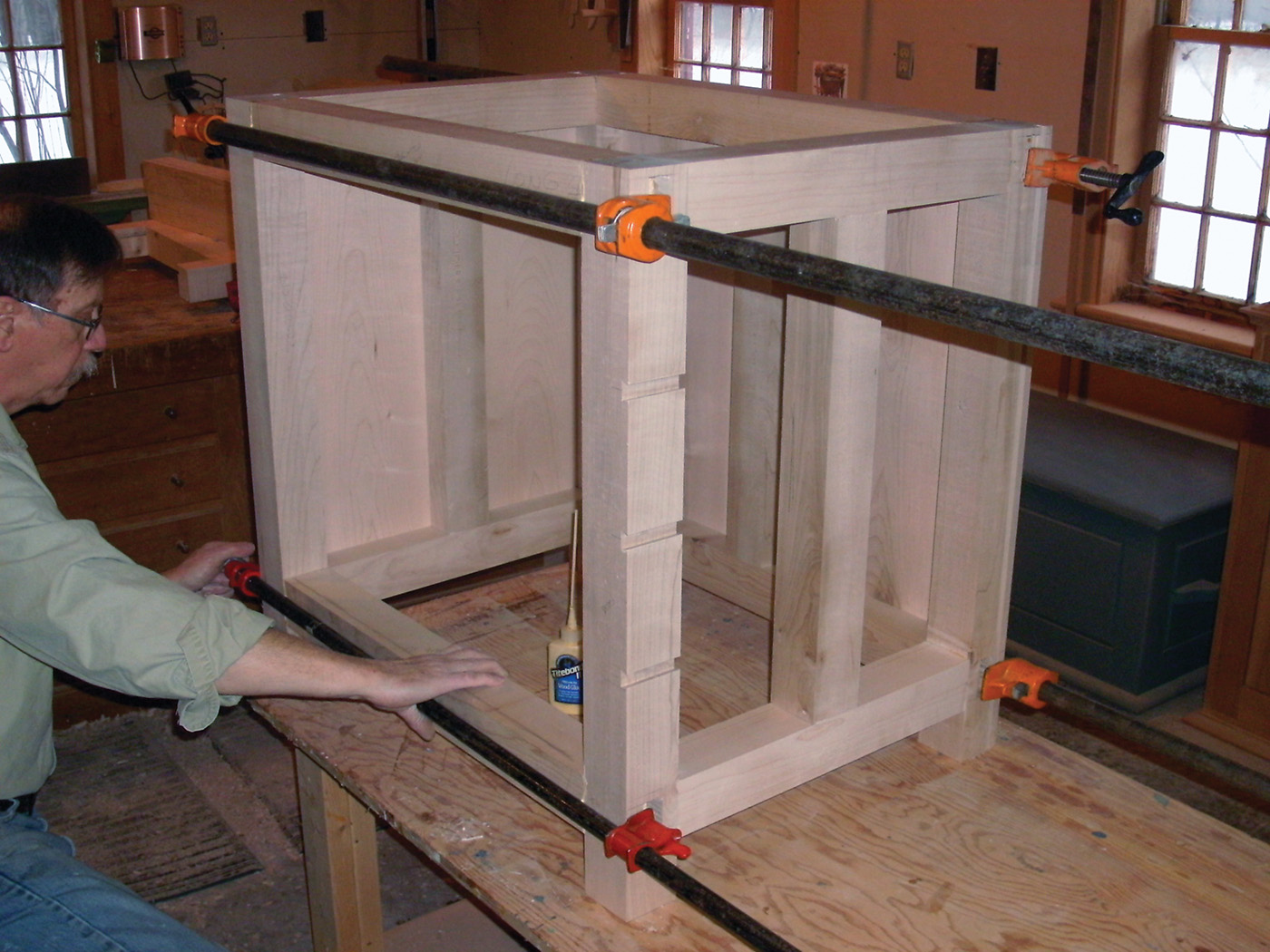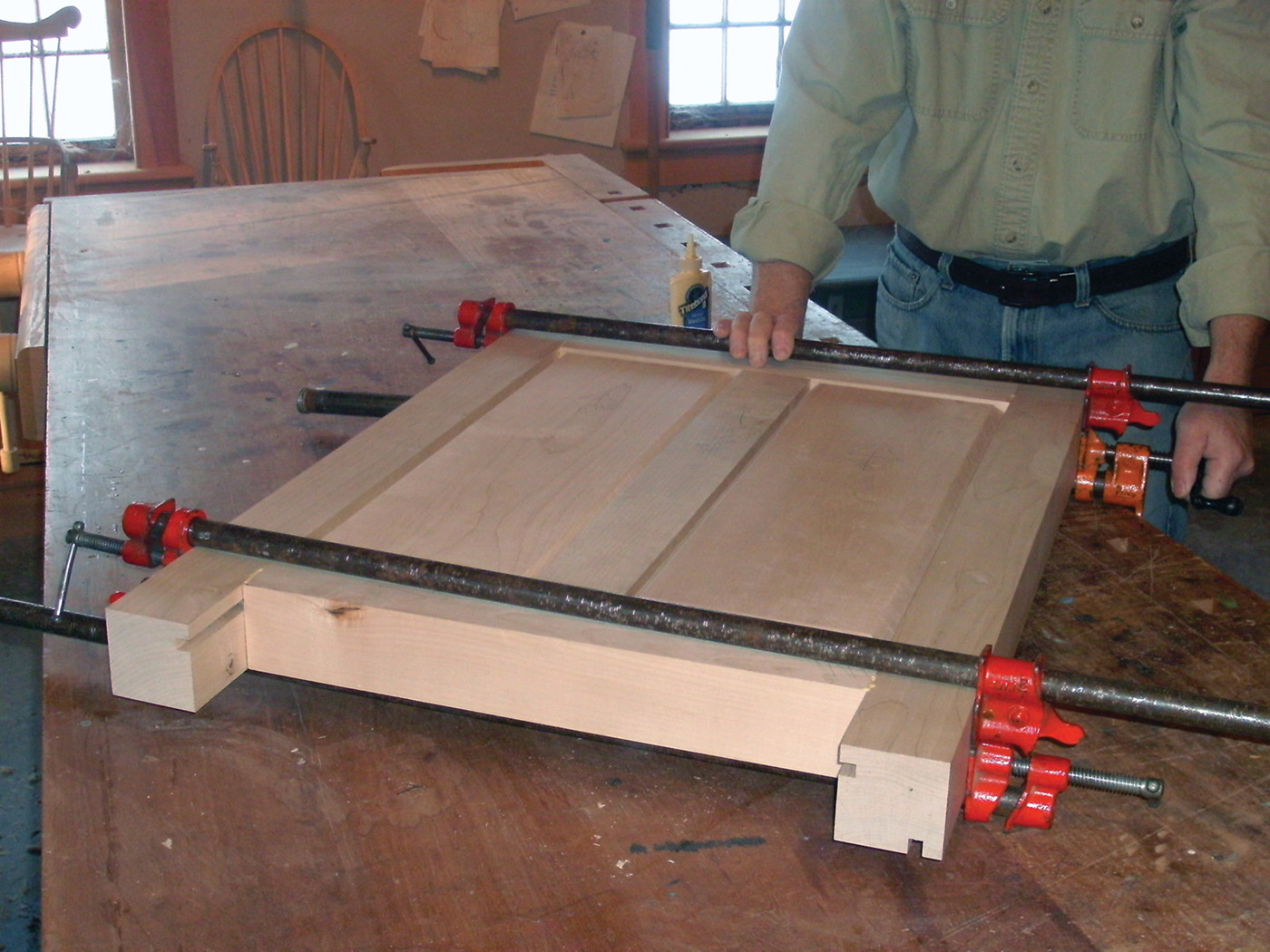 16 The benchtop is glued up from several boards, with cauls to keep it flat.