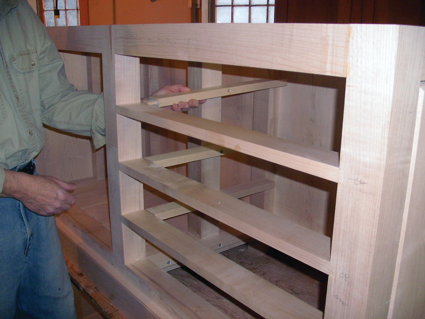 The remaining open bay needs only a floor and a pair of doors hung from the legs of the bents on either side of the opening. The floor is simply random widths of maple boards, splined together and loosely laid onto ledger strips screwed to the bottom rails and stretchers.