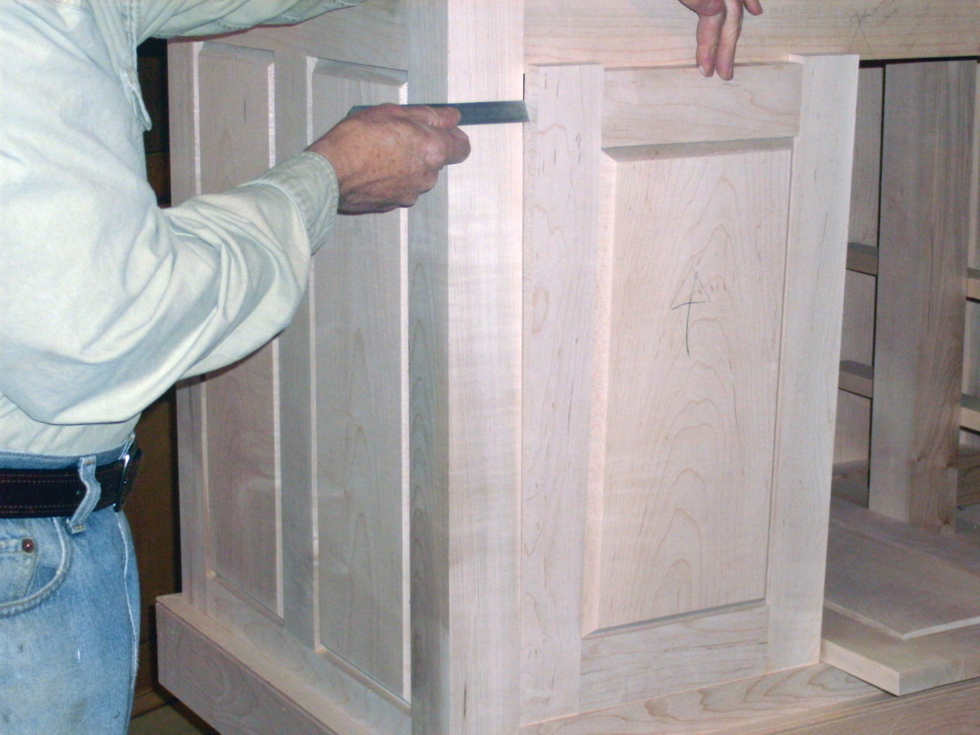 There were several main differences. First, I used the PantoRouter to do all the joinery. Next, I created all of the panels at the shaper instead of the table saw. See photos A and B. This was a two-step process. First, create the rabbet, and next cut the 45° chamfer using a V-bit.