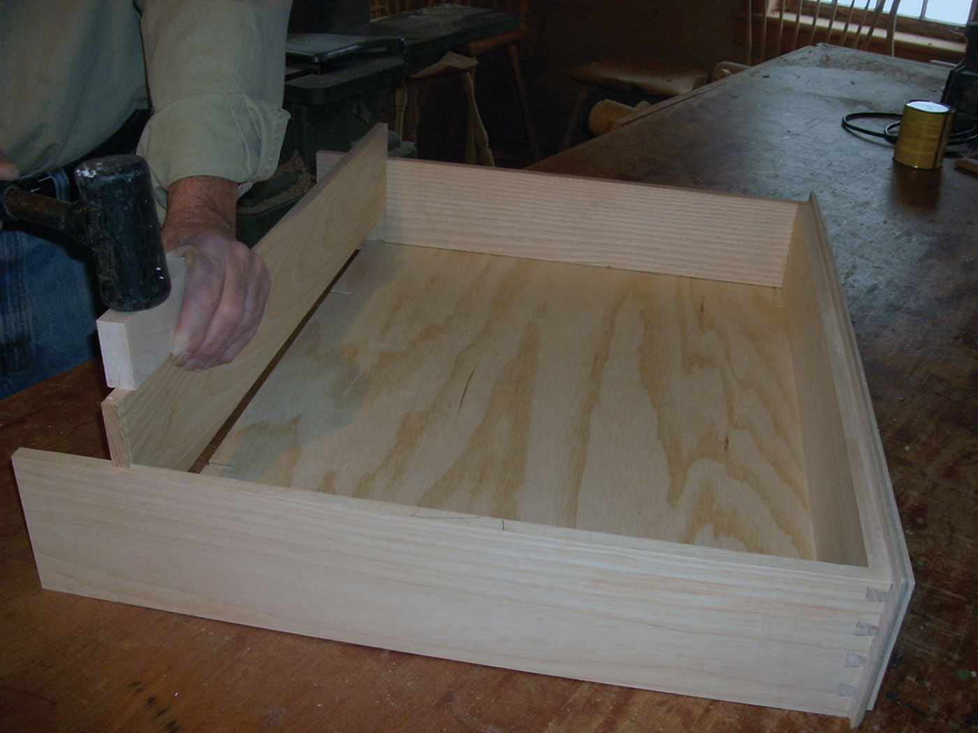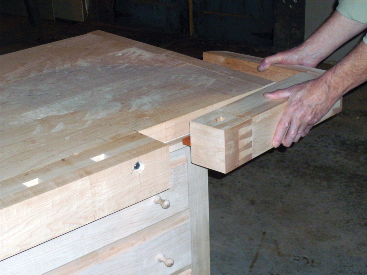 The drawer fronts are made of soft maple to match the base. The drawer sides and back are ash. The drawers are 20“ deep and the drawer sides extend 6“ past the drawer back. The extended sides let me pull the drawer out to its full depth without the drawer falling out. The drawer bottoms are cut from 1/2“ plywood. The plywood bottom is rabbeted to form a tongue 1/4“ thick and 5/16“ wide on the front and sides of each drawer bottom. The drawer bottom is glued to the front groove, but left to float freely in the grooves cut on the inside faces of the drawer sides. A slot cut in the back edge of the bottom allows a screw to hold the bottom tight against the back, while allowing for seasonal movement in the panel.