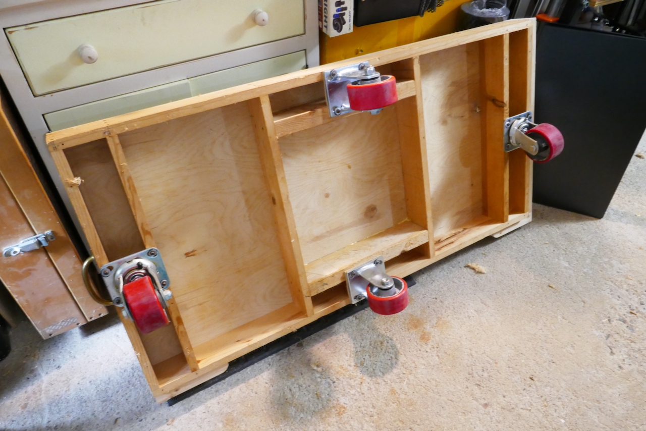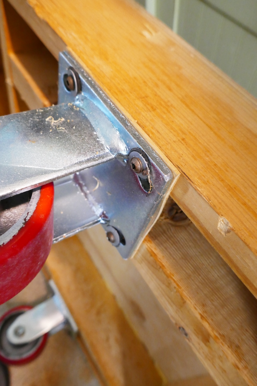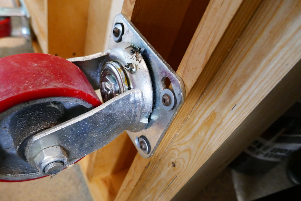 The cart I designed is true to this form. It features a sturdy wooden frame topped with a plywood plate. For the rolling hardware, I used two swiveled casters (one for each end) and two rigid casters for the center—the professional term for the fixed-direction type.