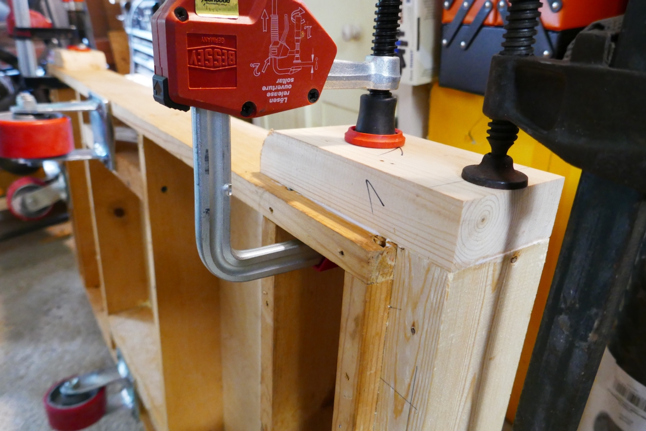 I cut and glued a U-shaped addition made from 2 x 4 lumber onto one of the short edges of the cart’s plywood deck. I made sure to create generous roundovers on all the new edges and corners to ensure no sharp points were left exposed as I move around the tight shop. You can achieve this using a router, a hand plane, or even just heavy-grit sandpaper.
