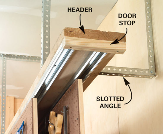 I mounted the sliding-door tracks on a 2×10 header that I anchored directly above the wide shelf with lengths of slotted angle extending from both the ceiling and wall (upper right photo).