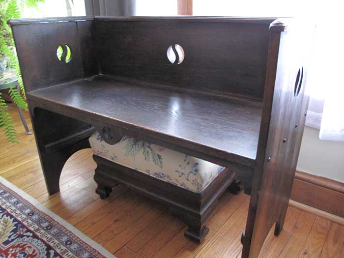 I mentioned in the article that I got the idea from an antique choir bench in my mom and stepfather’s house, but that I made a few changes from the original. Some of those changes were so the project would fit the ICDT paradigm; others were aesthetic. Since the issue’s been out, I’ve received several requests for a picture of the inspiration piece. So here you go (with my apologies for the poor image quality):