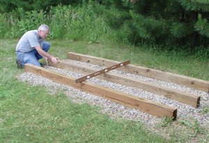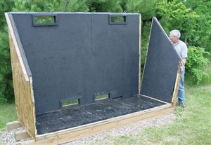 Click on any image to view a larger version. With care, a solar kiln can dry wood pieces that are just about any shape or size. You can often dry mixed species and thicknesses in the same load. A solar kiln makes it easy. Buying wood green and drying it yourself saves a lot of money. The big pile of green wood in front cost the same as the tiny pile of kiln-dried wood behind me. With this kiln, you really can “set it and forget it.” While your wood dries, you can get back to your shop or other interests. 1. I built the kiln’s panels in my shop using deck screws. Foam insulation board helps hold the heat in when the sun is down. Treated wood and plywood resist decay in the high moisture environment of a kiln. 2. To prepare a base for the kiln, I leveled treated landscape timbers on a bed of river rock in my backyard. A sheet of plastic under the river rock discourages weed growth. 3. The panels go together easily. I painted the kiln’s interior surfaces black to protect the wooden walls against moisture penetration and to help absorb more heat from the sun.