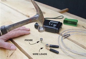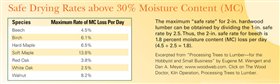 4. I started the stack with timbers to keep the drying wood up off the wet floor. I stacked the green wood to within about 6 in. of the bottom of the fan plenum. Stickers create a gap between each layer so hot air can be driven through the stack by the fan. 5. Two probes are hammered into a board in the middle of the stack. Wire leads are run out of the kiln, where a moisture meter can take readings. Sensors allow you to monitor the wood without having to open the kiln. 6. I topped the stack with cement blocks painted black for heat absorption. The weight from the blocks reduces warping in the drying wood. A plastic sheet attached to the plenum and draped over the top of the stack forces air through the stack. 7. With the help of a friend, I set the roof on the kiln. The removable roof hooks over the peak and is secured with screws through a cleat on the side. 8. Vents allow moisture to escape during drying. They are closed toward the end of the drying process to help maximize heat and get the wood down to the target 8 percent MC. Fig. A: How It WorksFig. B: Exploded ViewSafe Drying Rates |