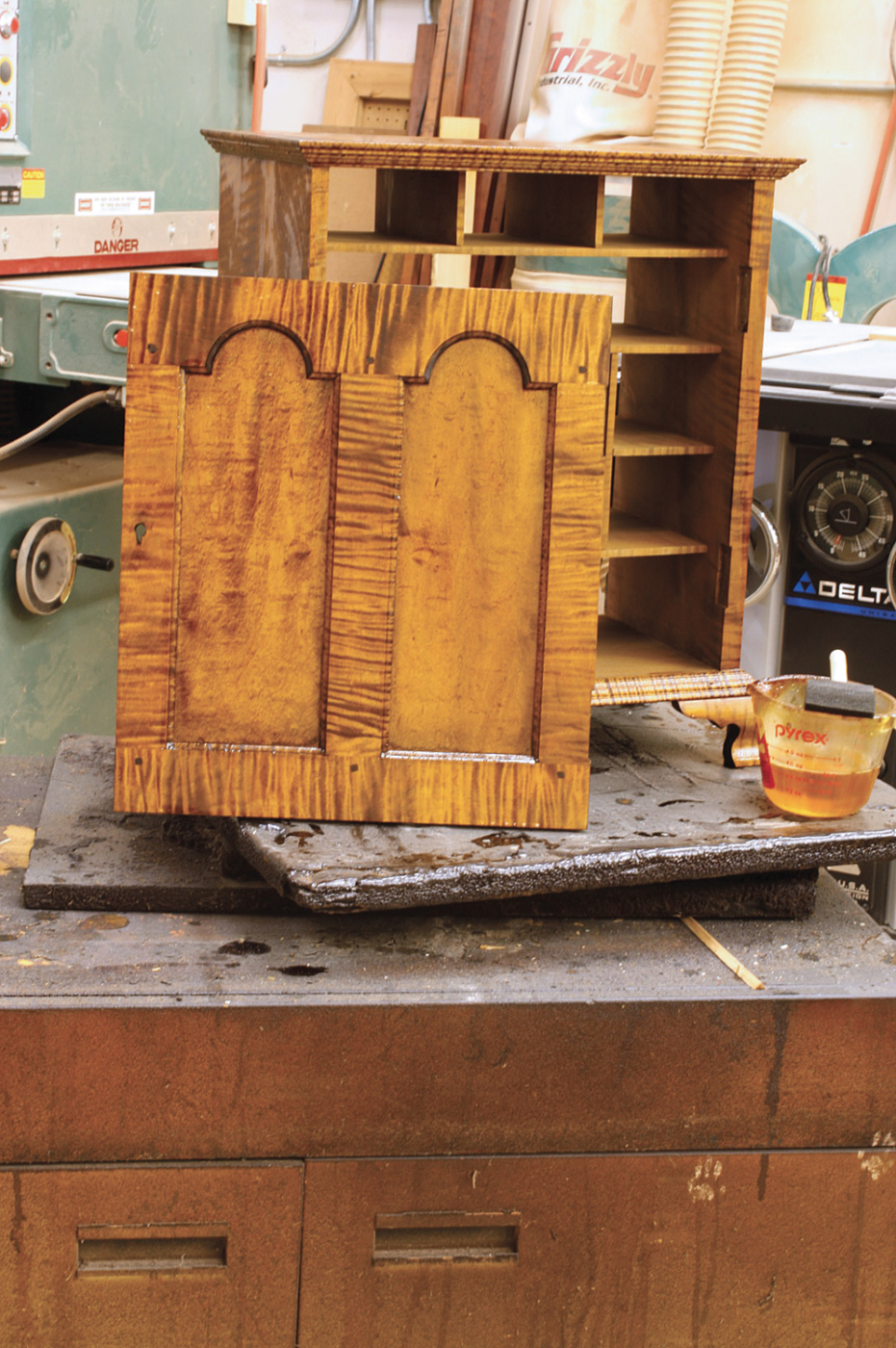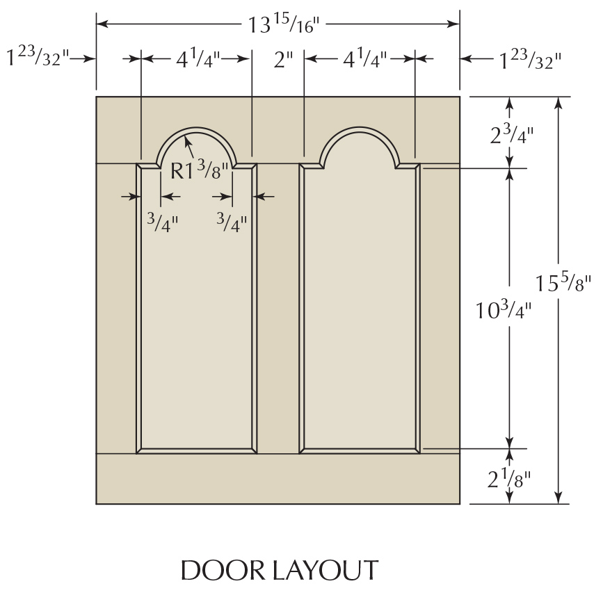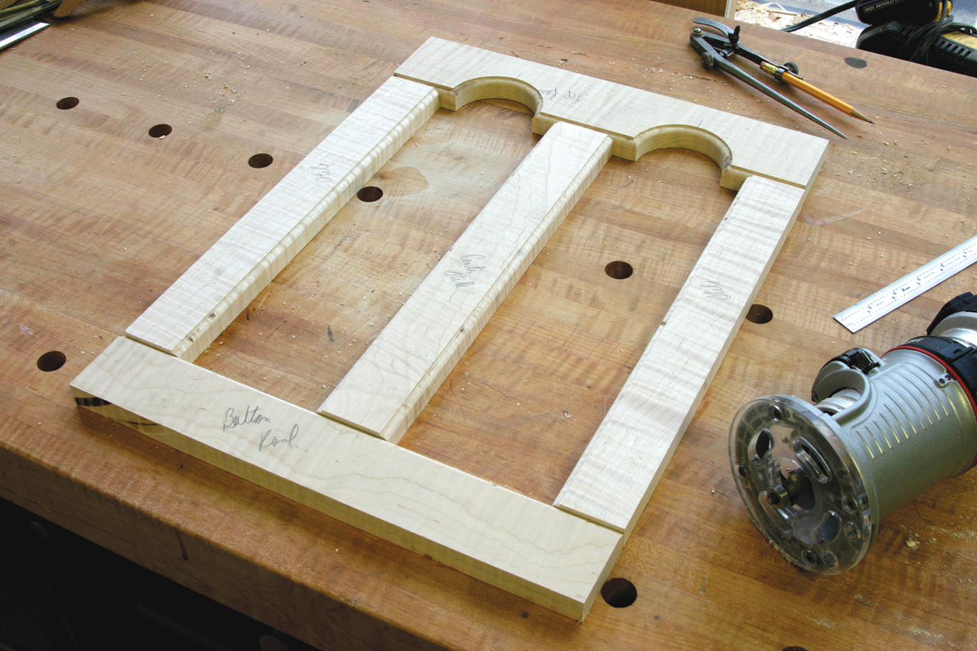 Door construction begins by roughing the door’s framework to size and thickness. Lay out, cut and smooth the arch tops in the top rail, then run a 3⁄16” roundover bit along each interior edge of all parts.