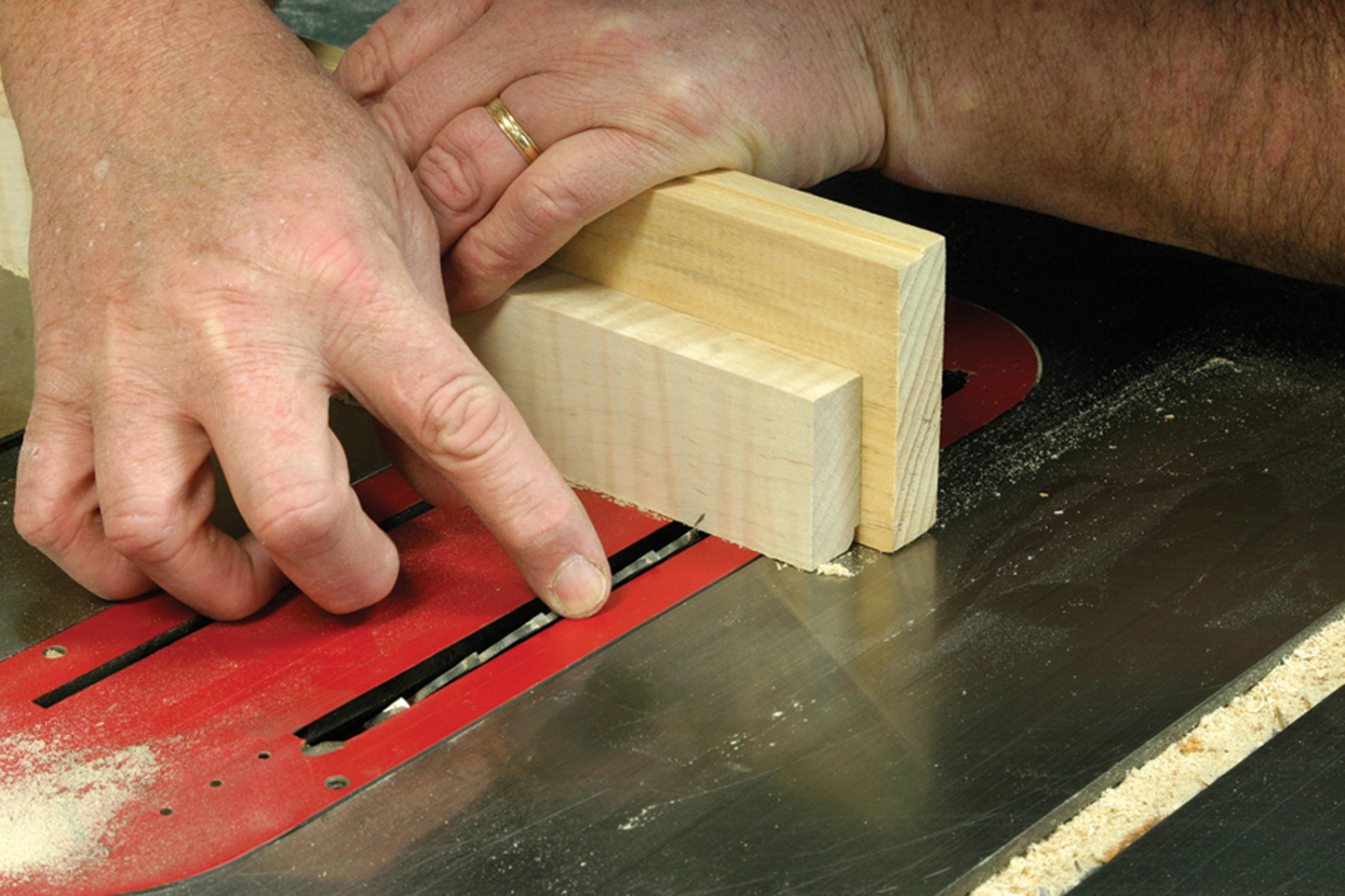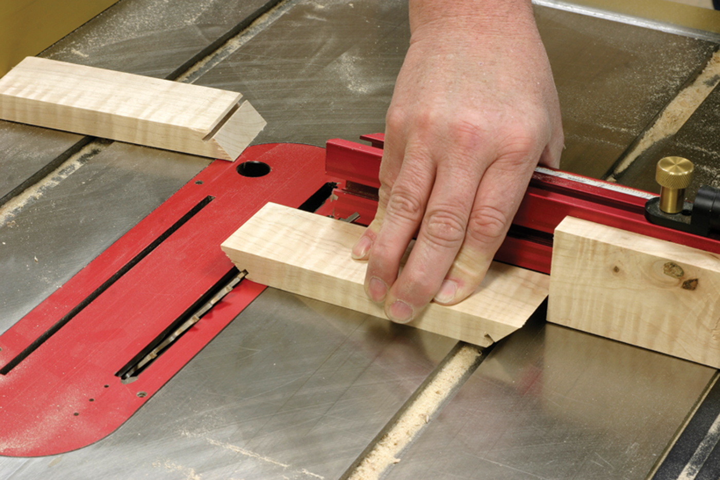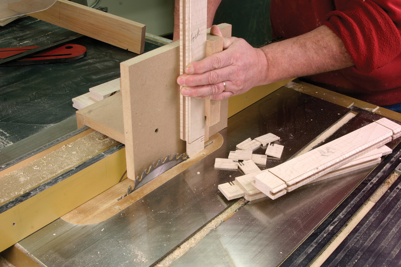 Begin with the rails. As shown in the photo above, use a miter gauge with a sacrificial fence to position your workpiece so the cut exactly hits your line just as the blade levels with the saw’s tabletop. When set up, make the first cut with the face against the fence. Rotate the rail so the face is toward the blade and make a second cut.