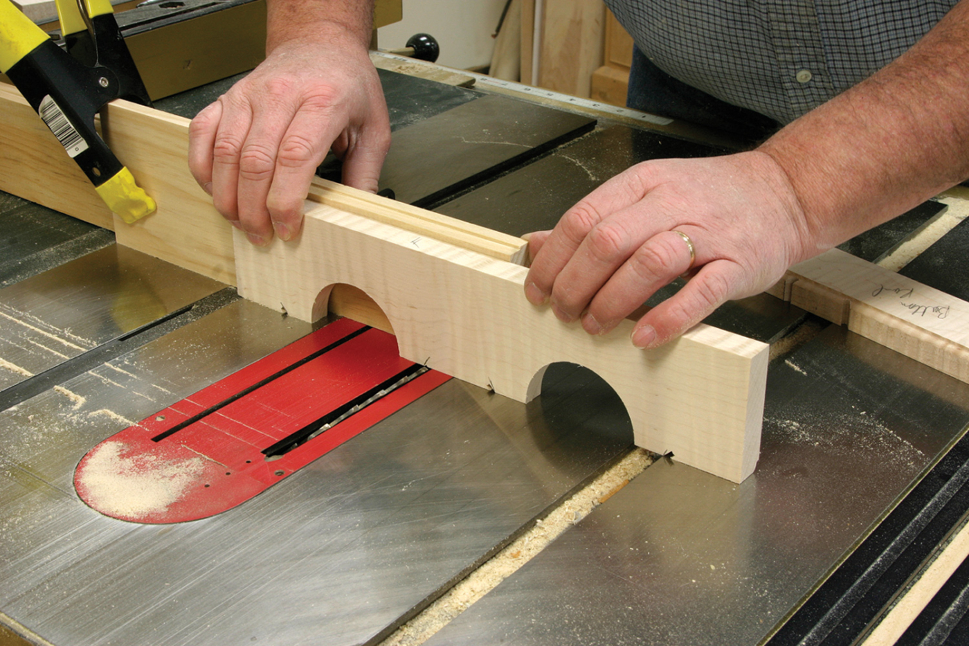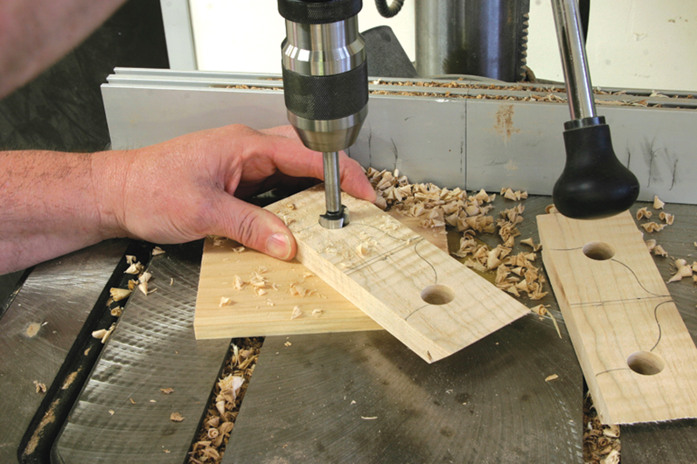 Transfer the pattern onto the stock holding tight to the mitered ends. Mark the centerpoint of the hole used to create the spur, then drill the 3⁄4“-diameter hole in all six foot patterns. Cut the remaining pattern lines at the band saw, then smooth your cut edges. (I used a spindle sander.)