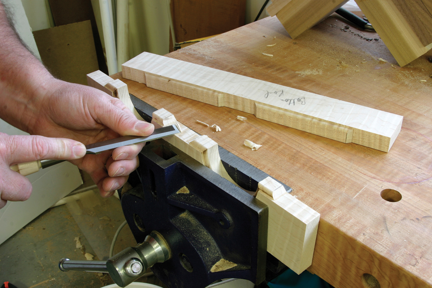Lay out and cut mortises in the top and bottom rails, then create your tenons. The shoulder cuts align with the bottom of the 45º angled cuts, and the cheek cuts are best completed using a tenon jig, although you could use a dado stack or make the cuts by hand. The oddity is that your haunch offset is 3⁄16” – the groove is 3⁄8” deep, but you’re removing the 3⁄16” moulded edge. Finish the tenons and check your fit.