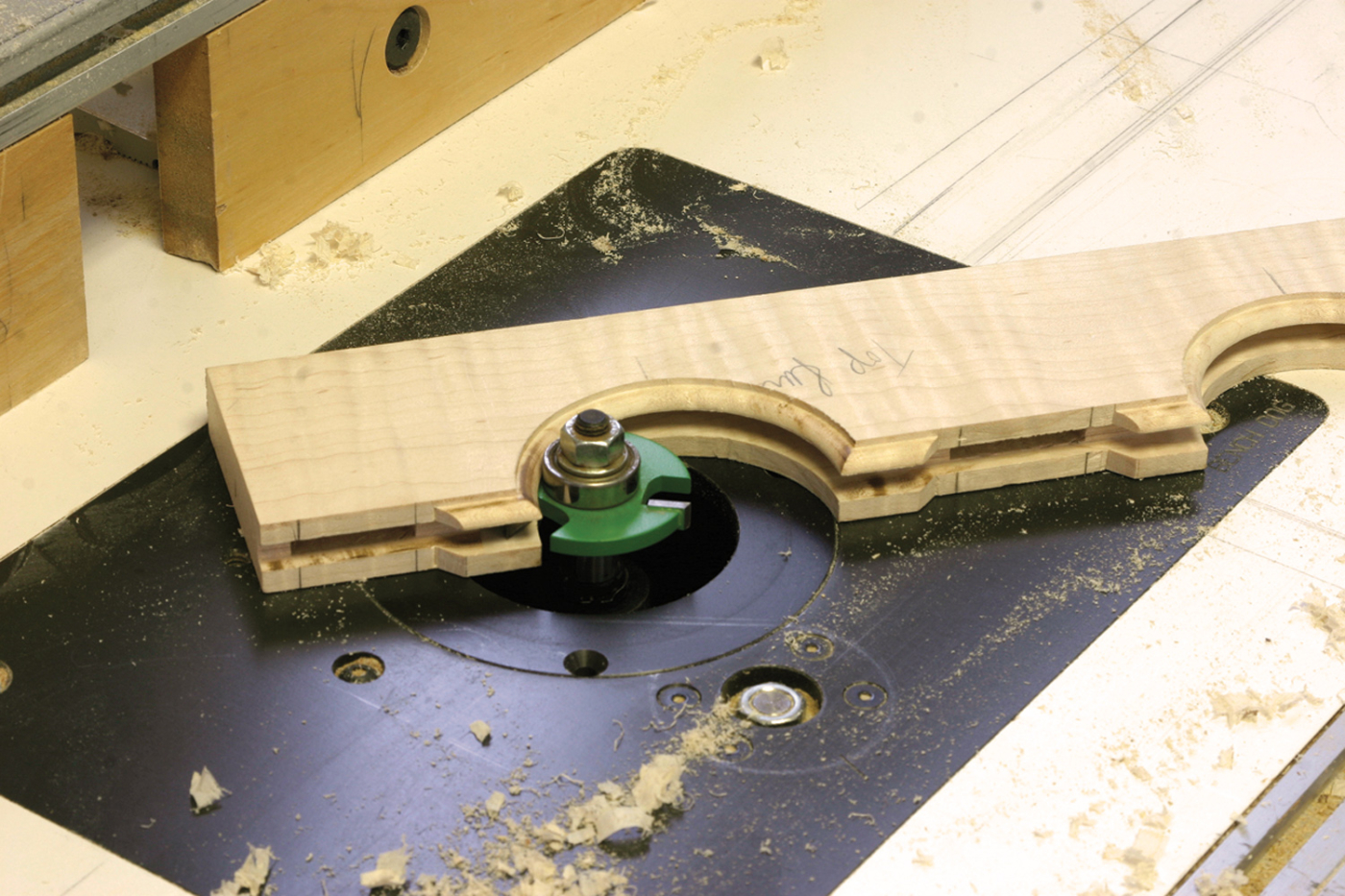 My panel grooves were cut on the table saw, but the top rail arches need additional work. In a router table, install a 1⁄4“-slot cutter bit that’s set to cut 1⁄2” in depth and align the cutting edge with the existing groove. Watch that the bearing properly contacts your workpiece. Also, you may wish to cut into the middle of the arch, or climb-cut a portion of the arch.