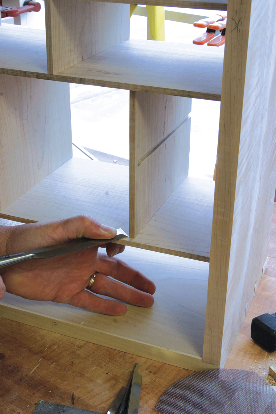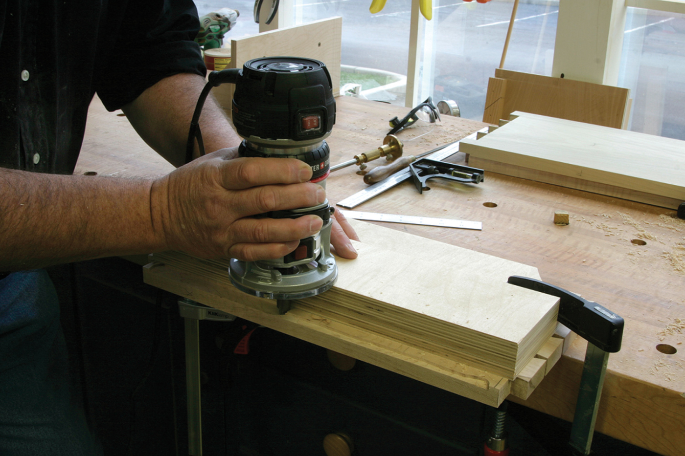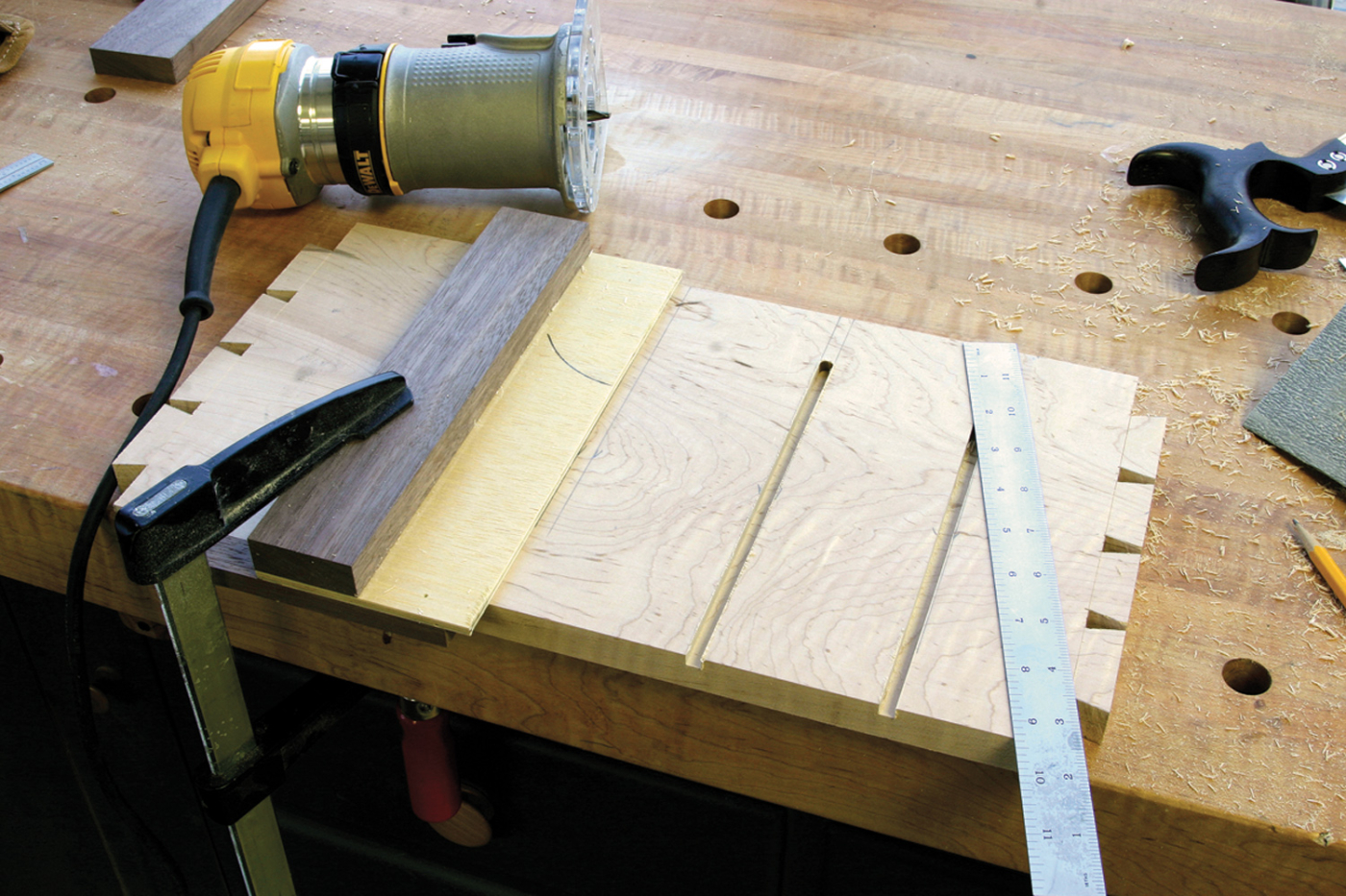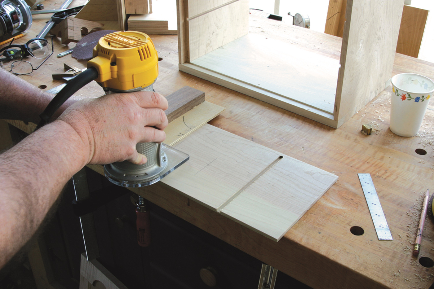 Rout stopped shelf dados using a 1⁄4“-diameter bit set to cut 1⁄4” deep, plus a simple shop-made jig as shown in the photo below. Don’t forget the two dados in the underside of the case top (use the plan to establish their locations). Before moving on, use a chisel to square the front edge of each dado.