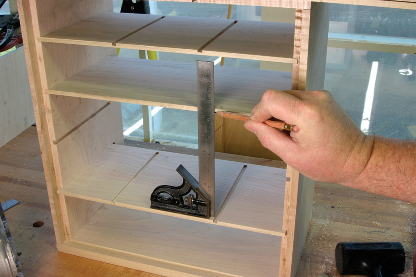Accuracy is a must. Keeping dividers square to the shelf is best done using a combination square. Align the square’s base to pinpoint the opposite dado.