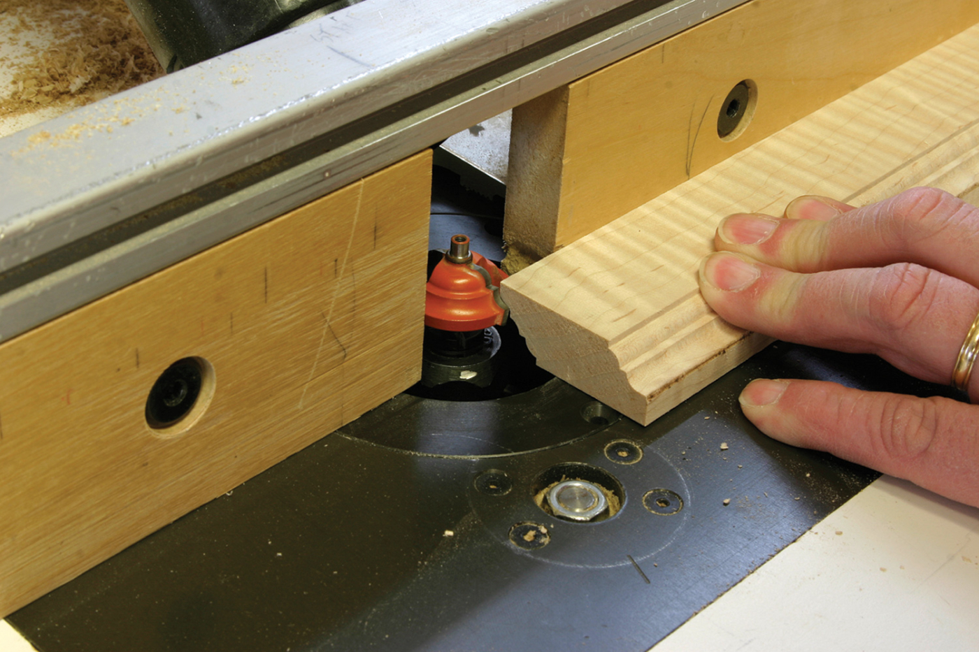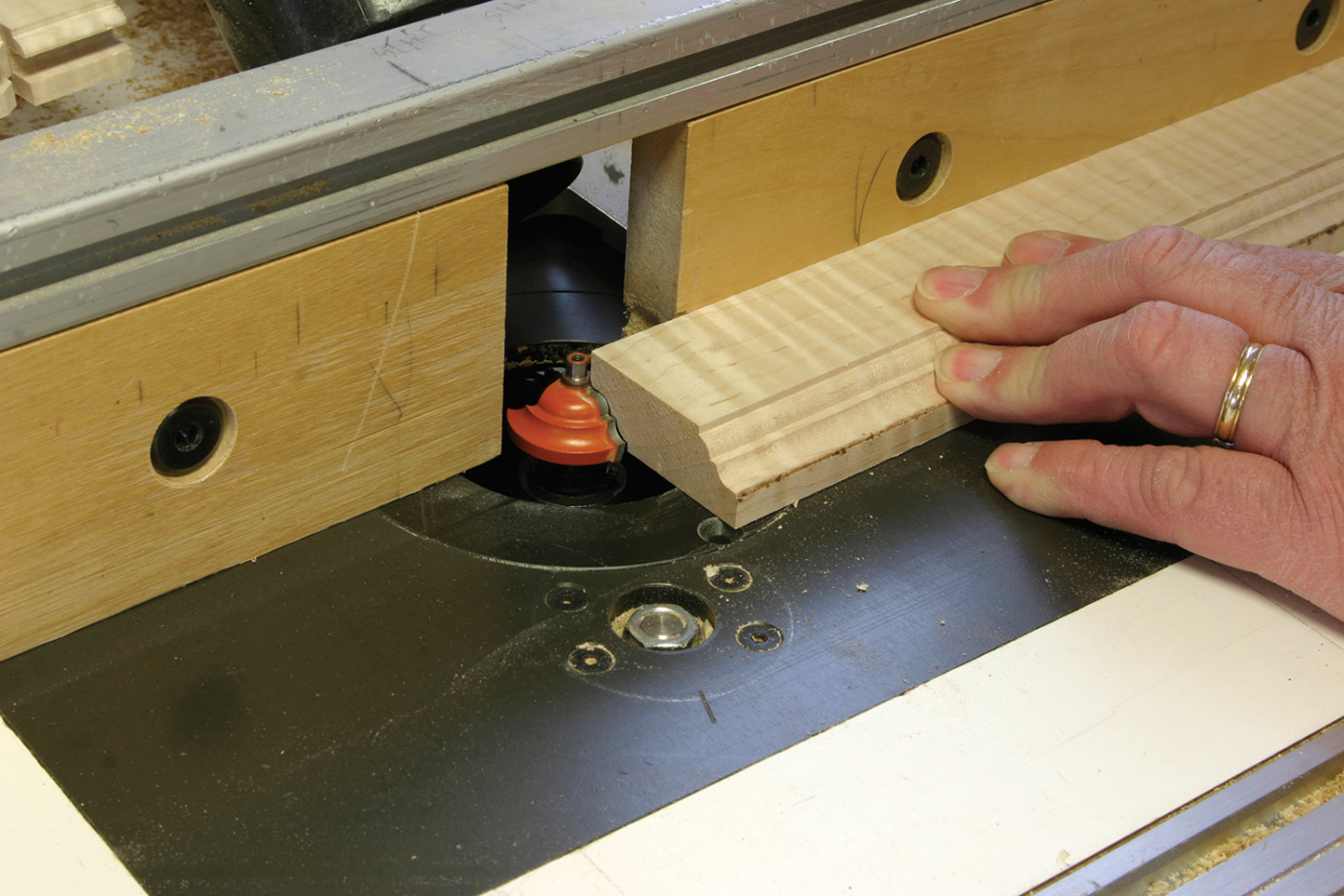 Begin by milling your stock to thickness. Chuck the bit into a router table, then remove the bearing. Position the fence to use the entire cutting surface of the router bit as shown in the photo above left. Don’t worry about any burning that comes as the material rubs the non-cutting edge of the bit because it’s removed in the next step. Run this cut on all your moulding stock. It’s a good idea to run extra moulding because the exact settings are difficult to duplicate if you should make a mistake along the way.