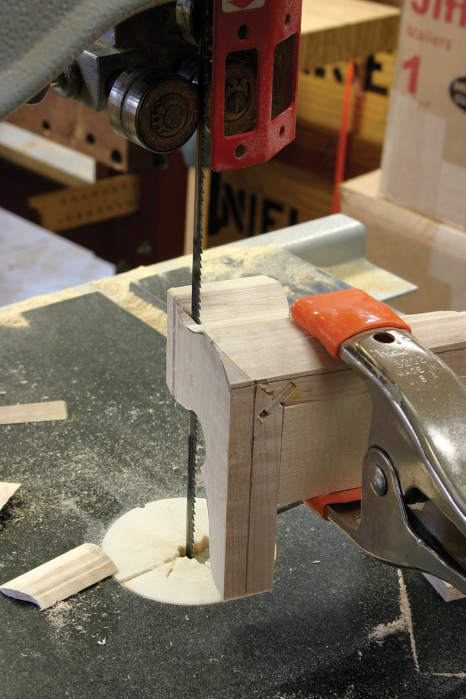 The assembled foot faces have the ogee profile drawn at both mitered ends. Position and secure the feet at the end of your jig with one foot hanging parallel to the band saw blade. Carefully saw the profile, remembering that any rough cuts need to be smoothed. Reverse the feet to cut the second ogee profile. There is no pattern line to cut to on the second foot, but there is a cutline. As you cut the first profile, the miter establishes the second cutline. Complete the ogee profiles on both front foot assemblies. The rear foot assemblies need only be cut on one face.