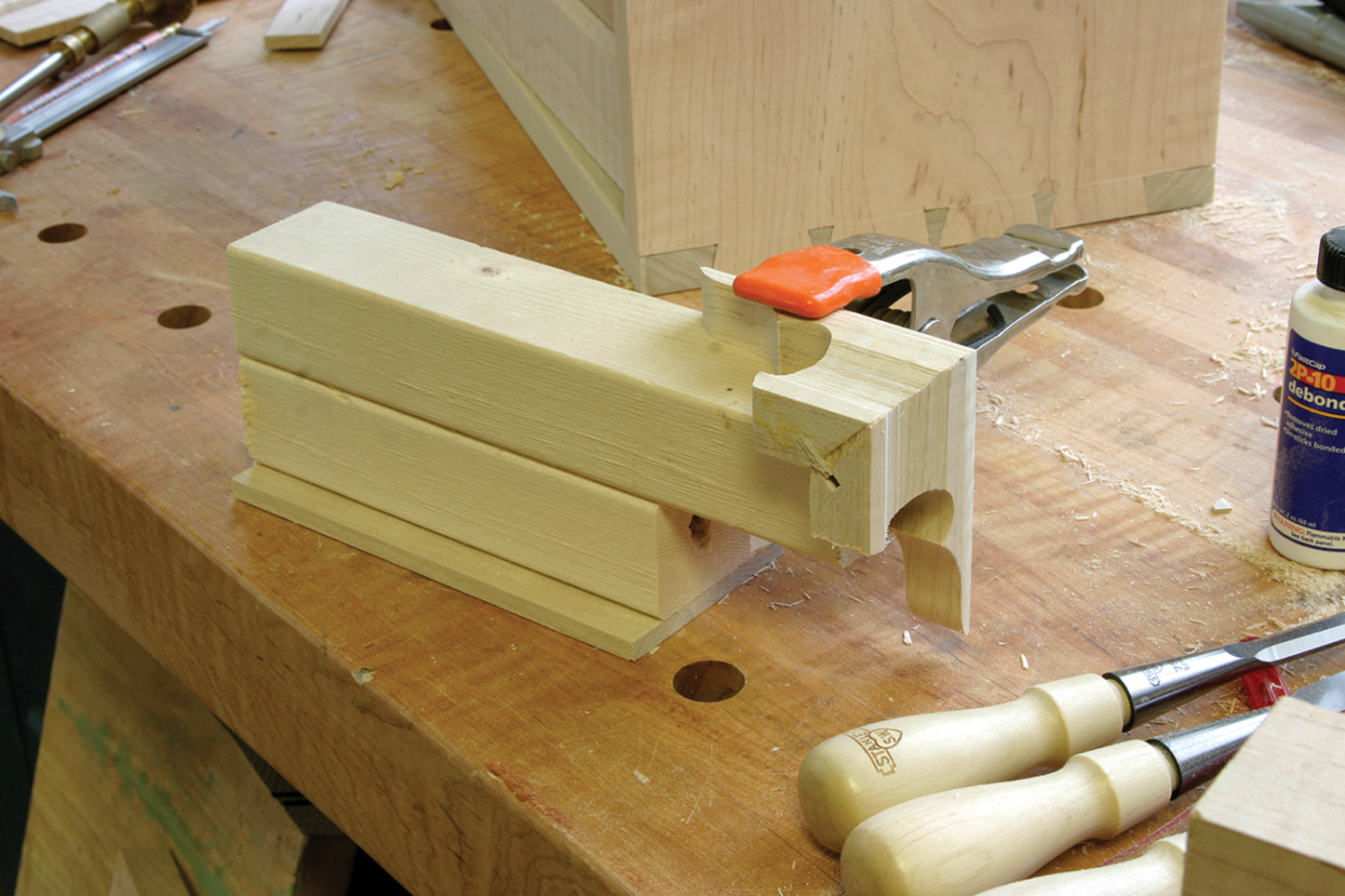To shape the ogee portion of the feet, you’ll need a simple jig that holds the assembly as you cut. Build a holder from shop scraps – two pieces of 11⁄2” x 11⁄2” x 8″ screwed together with an offset that allows enough room for a spring clamp to hold the feet as you cut, with a wider piece of 1⁄4” stock added for a more stable base.