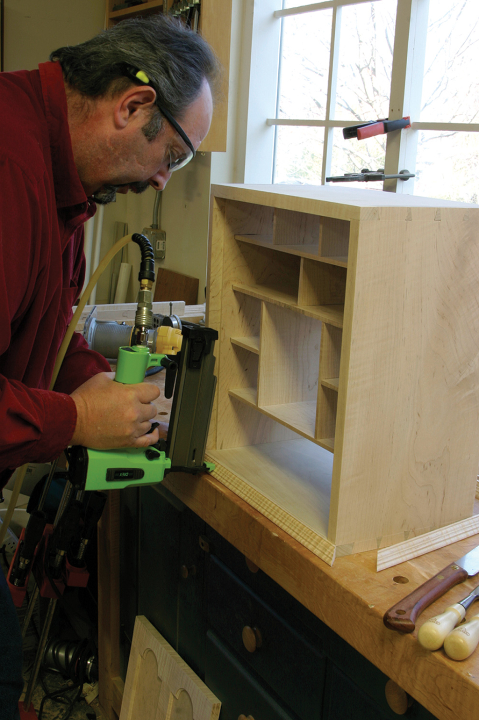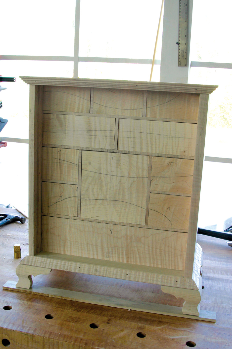 After the box is finished, cut and fit a backboard with the grain running side to side. If you use multiple pieces, half-lap the edges. The back is left unfinished and is nailed to the case sides.