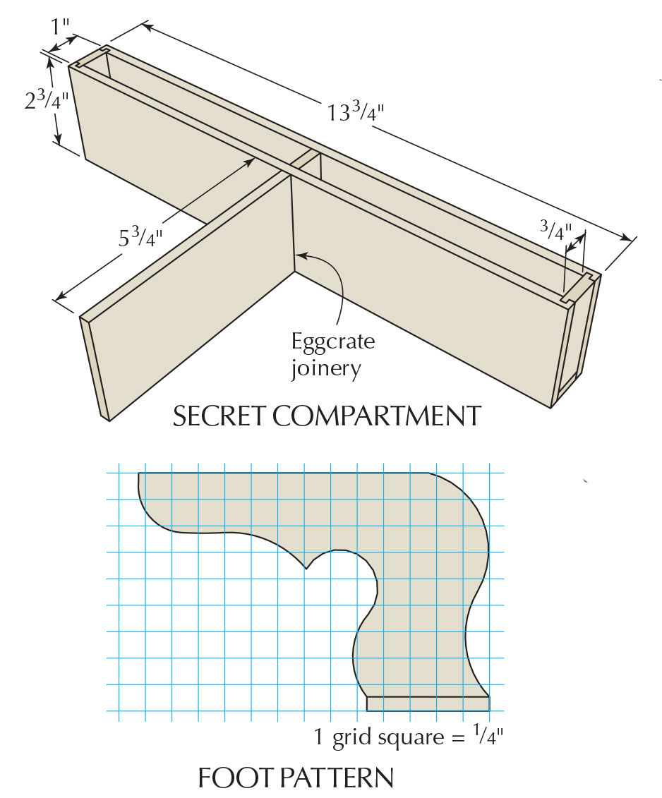 A single divider that is part of the secret compartment divides the second row. Just 3⁄4” in from the back edge of the divider sits the false back – what you see when the drawers are pulled from the case. The two are joined with an egg-crate joint, so fit that joint first in case it takes a couple shots to get things right. The ends of the secret compartment are rabbeted to slip into 1⁄8” dados cut in the false back and secret back. Those ends also rest on the secret compartment’s bottom that is sandwiched between the backs. To solidify the assembly, add a couple tiny glue blocks inside the compartment where the divider meets the two backs.