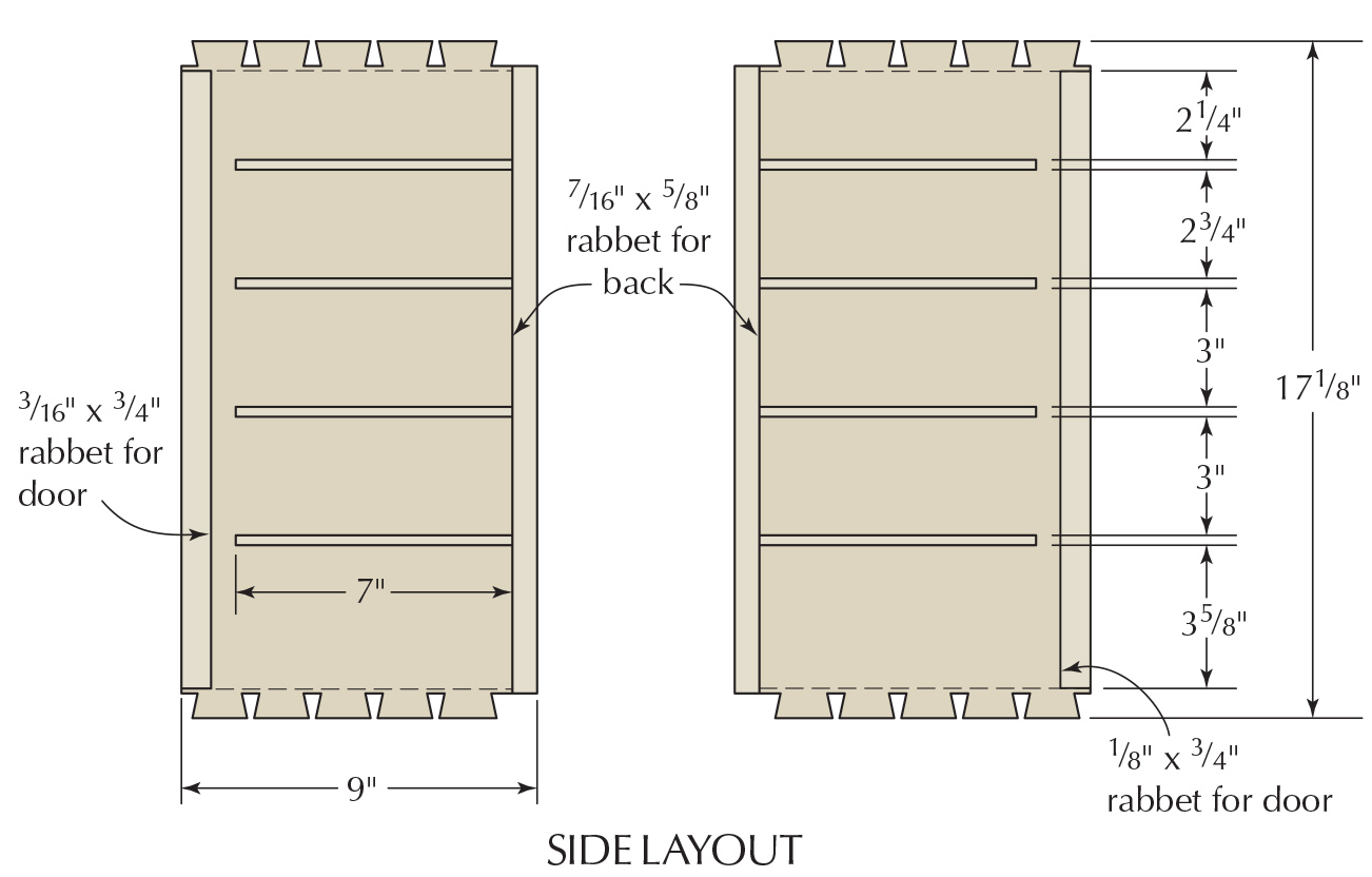 After mating tails are made in the case sides, lay out and mark the locations for the horizontal shelves that divide the drawer banks. Accuracy is a must, so establish the shelf locations at the front edge of one side, then transfer the marks to the second side. Working at the front ensures that any small variations are pushed toward the back.