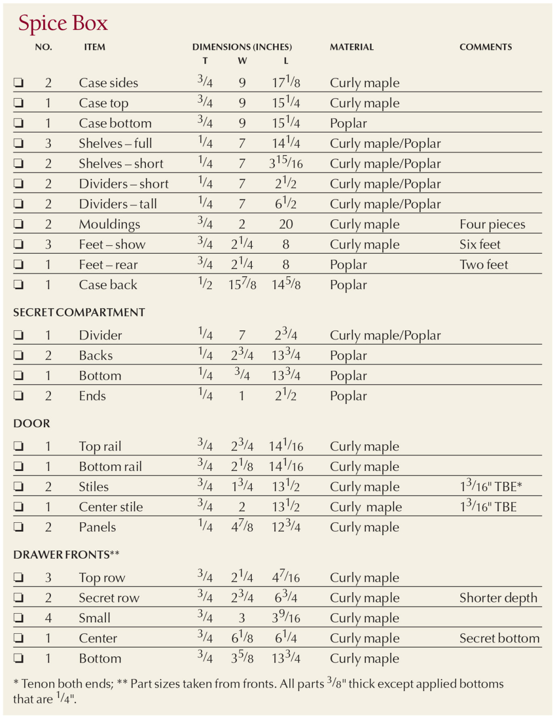 Spice boxes have captured my attention for many years. When I discover a new box, I immediately, as plans develop in my mind, get the urge to build my version. With all the great features stuffed into this box, who could keep from going directly into the shop?