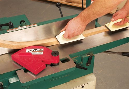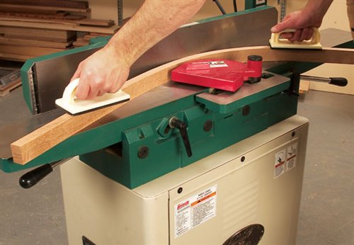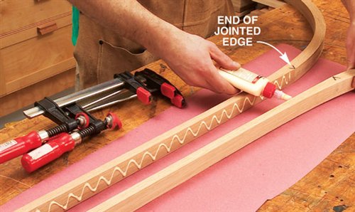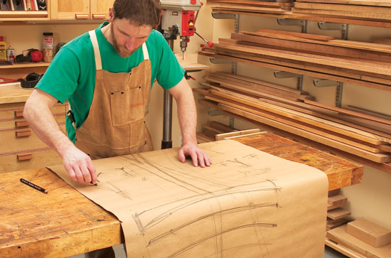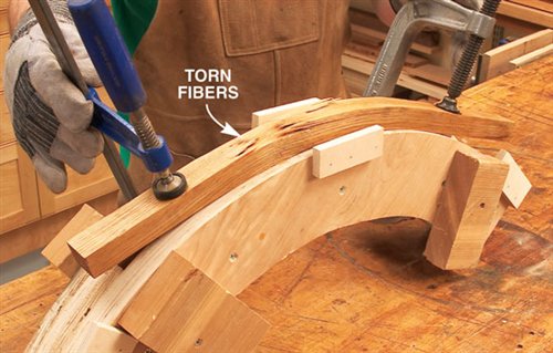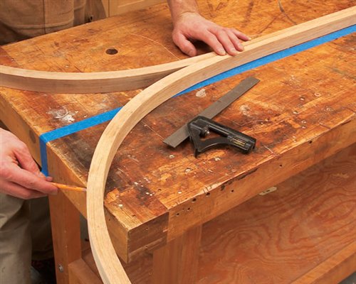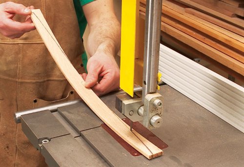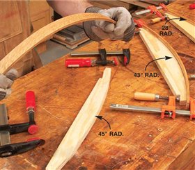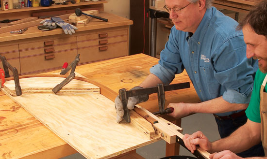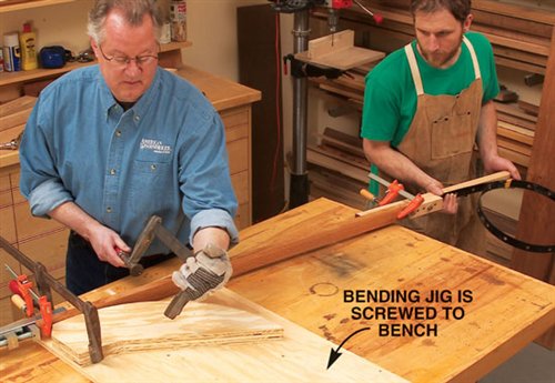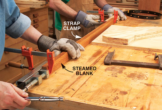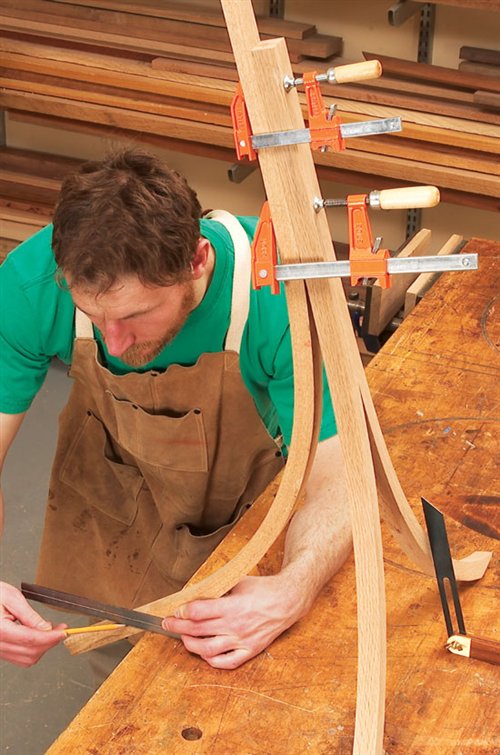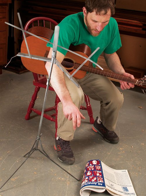1. After many years together, my flimsy music stand and I experienced the ultimate falling out. Rather than buying another utilitarian stand, I got the crazy notion to design and build one that would, somehow, visually represent the music I play. 2. I drew full size sketches to find inspiration. I wanted the stand to echo the blues music I love, so I decided to bend the wood, just like those soulful blue notes. This seemed the perfect opportunity to try steam bending, something I’d always wanted to do. 3. I built a steam box to experiment. I quickly learned to wear gloves: Steamed wood is extremely hot. I also learned you have to work fast to bend it. Once the piece is removed, its flexibility lasts less than a minute. 4. My first attempts at bending steamed pieces were disasters. Every time I tried to bend and clamp a piece over a form, the fibers on the outside face tore apart. What was I doing wrong? 5. I discovered that I needed a strap clamp and a dedicated bending jig to successfully bend the thick, kiln-dried pieces I was using. The strap clamp (see Sources, below) wraps the steamed piece and keeps its fibers from stretching and tearing apart as it’s bent. The bending jig must be securely fastened to a work surface. I also made drying forms that matched the bending jig, so I could bend three leg blanks in a single day. 6. Bending the steamed leg blanks is definitely a two-person job. We needed to work efficiently as we pulled the blank from the steam box and clamped it in the strap clamp. So we rehearsed the entire bending process first, to choreograph our steps and make sure all the tools we needed were close at hand. 7. As soon as my partner clamped his end of the blank/strap clamp assembly to the bending jig’s curved block, I immediately started the bend. Every second counts. He quickly added another clamp to help the blank conform to the curved block. 8. Once the blank was clamped to the stop, we could relax. The entire bending process, from removing the steaming blank to applying the last clamp, takes less than a minute. 9. After an hour in the bending jig, I transfered the bent leg blank to a drying form. This way I could immediately reuse the bending jig. After transferring the second blank to another drying form, I left the third blank on the bending jig. 10. I discovered that the bent leg blanks had to be edge jointed, because they were always slightly twisted. To joint a perpendicular edge, I had to swivel the bent blank as I made the cut, while keeping its outside face flush against the fence. 11. I created a flat gluing surface on each leg blank by jointing the top portion of its outside face, above the bend. I made the same number of passes on each blank, so their remaining thicknesses matched. Because of the bend, each pass lengthened the jointed surface. 12. Before I glued the two front legs together, I marked the points where their jointed surfaces ended. I aligned these marks when I clamped the legs, so they would splay equally. 13. To mark the front assembly’s feet for trimming, I turned my bench into a T-square. The last thing I wanted was a leaning stand! I positioned the assembly so the legs’ splay was the correct width at the bottom edge. Then I aligned the shaft with a perpendicular strip of masking tape. 14. Establishing the stand’s backward tilt was another head-scratcher. My solution was to clamp the back leg in position and allow it to fall behind the table. When the tilt angle was correct, I marked the back leg for trimming. 15. To get the graduated