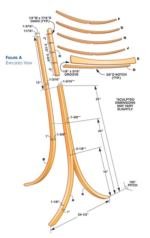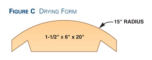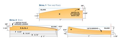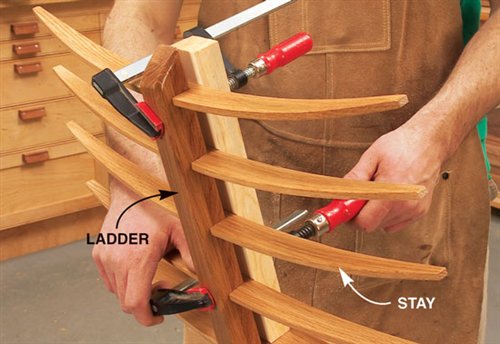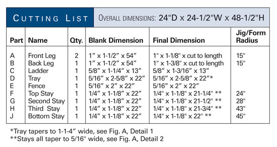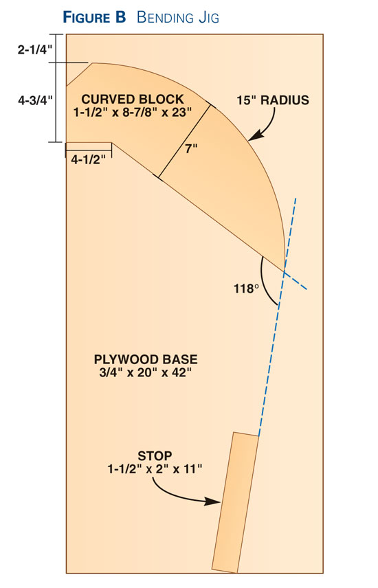 One thing I can tell you is that steam bending is as much art as it is science. So many variables affect the way each piece of wood bends, the outcome can be difficult to predict. I’ve found that the best way to achieve consistent results is to control as many variables as you can. First, use the right wood. White oak, the species I chose, is one of the best. Straight grain is a must and each piece should be as defect-free as possible. Many experts recommend using green wood, but once I refined my technique, I had good luck bending my kiln-dried white oak boards. A bending jig and a pair of drying forms are crucial for success. Their curves must be smooth and consistent. The jig and forms I used for this project came from the scraps of 3/4”-thick exterior grade plywood that were left after I built my steam box. I laminated two pieces of plywood to make some of the curved parts; others are just one piece thick. Once the wood comes out of the steam box, it begins to loose its flexibility in a minute or less, so you need to work fast. It’s best to engage a friend’s help and choreograph all of the steps by making dry runs. This music stand requires only five board feet of lumber, but I recommend buying at least four times as much, so you can practice and refine your bending techniques. I resawed 8/4 stock to make all the parts. Tailor Your DesignWhile dreaming up and designing my stand (Photos 1 and 2), I made some critical decisions. To simplify the construction, I decided the stand would be non-adjustable. Then I decided it would be used when I was seated. Finally, I adjusted its backward pitch to suit my playing posture. The bending jig and drying forms can be easily modified if you want to make aesthetic changes. My Big BreakAt first, most of my bending experiments failed (Photos 3 and 4). The turning point came when I discovered Lee Valley Tools’ Veritas strap clamp and instruction booklet on steam bending (see Sources, below). The booklet shows how make bending jigs and drying forms to use with the strap clamp. These tools, along with my steam box and kettle made all the difference (Photo 5). Bend the Leg BlanksI started by sawing a bunch of leg blanks (Fig. A, right, Parts A and B, and Cutting List). I planned to use some of them for test-bending and I wanted to have more than three bent blanks to choose from for the base. I’d already built a steam box (see “Simple Steam Box”), so next I built a bending jig for the leg blanks and a pair of drying forms (Figs. B and C). I cut the curved profiles on the bandsaw and used my disc sander to smooth the curves. Then I screwed and glued the curved block and stop to the base. After experimenting with different lengths of time, I settled on steaming each leg blank for one hour. To maintain the recommended 200-degree temperature in the steam box, I had to refill the kettle 2-3 times per one-hour cycle. Once the blank was removed from the steam box, I learned that every second counted. The faster it was bent and clamped onto the jig, the better it conformed. Taking one minute longer made a huge difference in the amount of springback (the tendency to straighten out) when the blank was removed from the jig. I discovered I couldn’t work fast enough to successfully bend the leg blanks by myself, so I enlisted a partner. While the first blank was steaming, I fastened the bending jig to my workbench and set up the strap clamp so it was less than 1/4-in. longer than the blank. We made sure we had clamps, gloves and everything else we needed before we removed the blank (Photo 6). Pre-setting the strap clamp paid immediate dividends, because tightening it only took a couple of twists with the ratchet. Our dry-run do-si-dos through the bending process also paid off, because clamping the blank to the jig and completing the bend took only seconds (Photos 7 and 8). Occasionally, we had to reduce the strap’s clamping pressure as we bent a blank around the form, to keep the curve from buckling. We also had to make sure the blank stayed seated on the base of the bending jig. If it rode up on the curved block, we whacked it back down with a mallet. After an hour, we took the bent blank off of the jig, removed the strap and immediately clamped the blank to one of the drying forms (Photo 9). As we’d started steaming another blank as soon as the first one was bent and clamped, we were ready to repeat the bending process. When all three blanks were bent, we headed to the golf course: The blanks had to stay in the forms for three days to stabilize. Turn the Blanks into LegsI squared up the three blanks I’d chosen to use for legs in two steps. First I jointed one edge (Photo 10). Then I planed the opposite edge. I left both front leg blanks 1/16” oversize in width. I milled the back leg blank to its final width. Next, I returned to the jointer to create flat gluing surfaces on the top portion of each blank (Photo 11). After jointing, the top ends measured about 11/16-in.-thick. The last step was to get rid of the black stains left by the metal strap clamp. I used a hand-held scraper. Build the BaseWhen I glued the front two legs together, I aligned the terminus points of their jointed faces (Photo 12). I removed all the squeezed-out glue before it dried. Then I marked and trimmed the feet (Photo 13). I trimmed the front leg assembly to its final height and then hand-planed it to final thickness, making sure to create a flat gluing surface for the back leg. To determine the stand’s tilt, I clamped the back leg so it extended 13-in. above the front leg assembly (Photo 14). After cutting the back foot, I glued the back leg to the front assembly, taking care that it remained centered. I used a level to make sure it was plumb. After the glue had dried, I shaped the base by planing, scraping and sanding. My belt sander was particularly effective! I aimed for uniformly smooth arcs and curves. Install the Ladder and TrayAfter milling the ladder (C) 