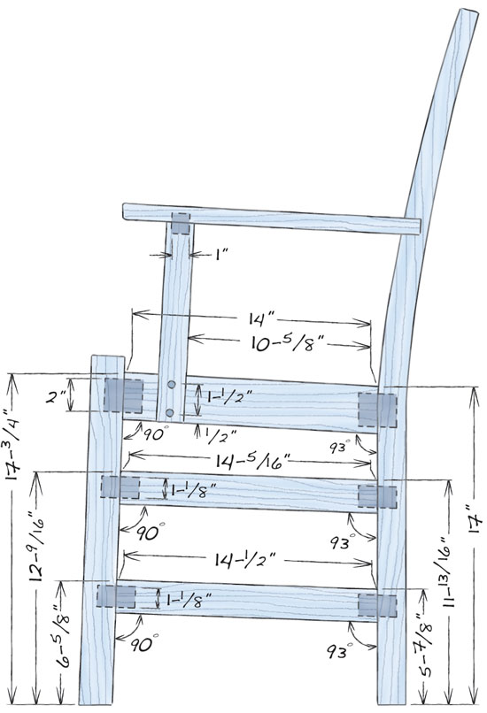 For convenience, the part letters in the arm chair cutting list and drawings are simply doubled: Part A for the dining chair is Part AA for the arm chair, and so forth. Of course, the part dimensions and rail angles for the arm chair are different, because it’s bigger. Here’s how to make and attach the arms.1. Make a pattern for the arms (Part VV, Fig. AA, and Fig. KK) and trace them onto the arm blank. Bandsaw the shape of the arms out of the blank. Sand smooth (Photo 1). 2. Cut out the arm brackets (WW and Fig. LL). Rabbet each bracket to overlap the seat rail. 3. Using the mortising jig, rout a 1/4″ x 1″ x 3/4″ deep mortise in top end of each bracket. 4. Bandsaw the taper on the outside face of each bracket. Remove the saw marks by sanding or scraping. 5. Drill 3/16″ dia. shank holes for the fastening screws. Counterbore these holes for the wooden buttons (XX). Finish sand both brackets and ease the edges with the 3/32″ roundover bit. 6. Clamp each bracket to the seat rail and set the arm on top, so the notch meets the back leg at the correct height. Scribe the bracket’s location on the bottom of each arm. Hand-chop mortises in the bottom of each arm to match the mortise on the bracket. 7. Assemble the arm and bracket and fit the assembly to the back leg. Scribe the angle where the arm meets the back leg (Photo 2). 8. Install loose tenons and glue and clamp the arms and brackets. 9. Position the arm-and-bracket assembly on the chair. Drill 7/64″ pilot holes for screwing the brackets to the seat rails. Then fasten the brackets with glue and #10 x 1-1/2″ flat head screws. 10. Fasten the arm to the back leg. First, drill a countersunk shank hole for the screw through the leg. Then drill a pilot hole into the arm. Carefully drive a #10 x 2″ flat head screw into the back of the arm (Photo 3).