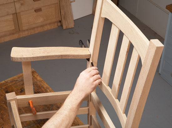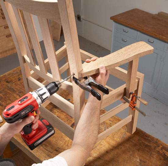 3. Drive a screw to hold the arm to the back leg. The arm and bracket are already glued and fastened. Drill a pilot hole before driving the screw, to prevent cracking the end grain.