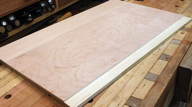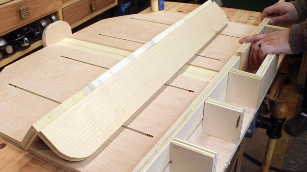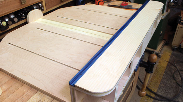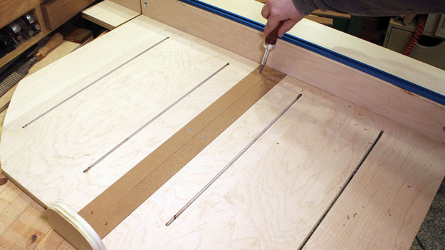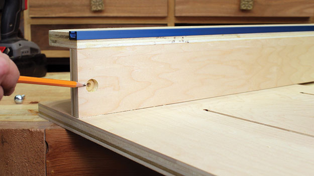 Begin the hardware installation by securing T-track in the rabbet on the fence panel assembly, and to the top edges of the extension supports on your fence slide-outs. Don’t try to drive the screws without first boring pilot holes! You risk spreading the plies in the edge of the fence face panel beneath, compromising its smooth and accurate surface.