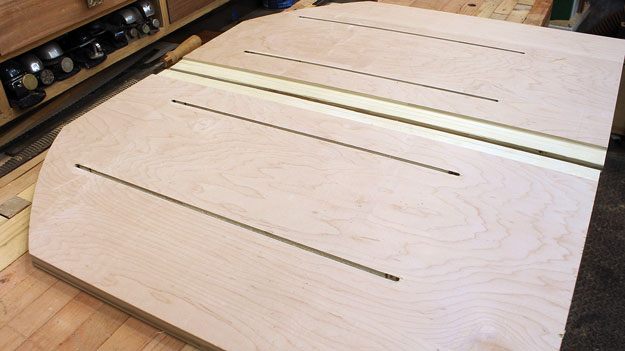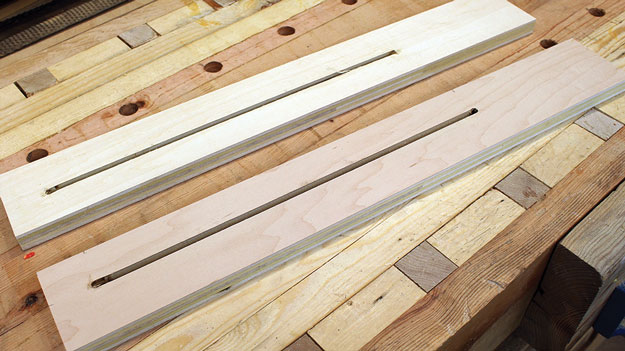 Slots. Rout slots down the center of the dados, creating a track for the shaft of your T-bolts to run in. You might also wish to round off the front corners of the panels, though it’s not strictly necessary.