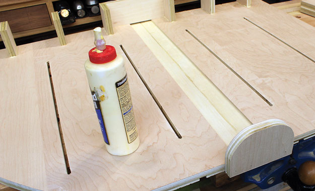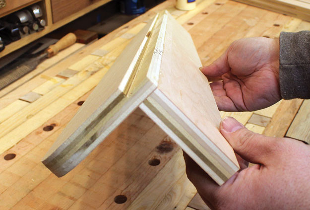 Returning to the top of the sled, check the fence panel assembly for square before the glue sets up. If the face panel isn’t perpendicular to the base of the sled, nudge the rabbeted top panel forward or backward a tiny bit as needed to correct it. Finally, remove the two fence extensions you’ve been using as spacers…before the glue dries and they stay in there forever.