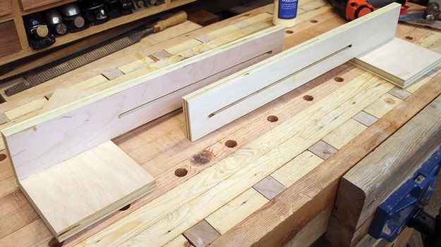 Place the two panels on your benchtop with the rabbets facing upward and touching each other. Mark the edges nearest you as “front” and the opposite edges as “back.” Now use a 5⁄16″ router bit to cut a slot down the center of each of the four dados, beginning 6-1⁄2″ from the front edge and 4″ from the back edge of each panel. The slots are for the T-bolts.