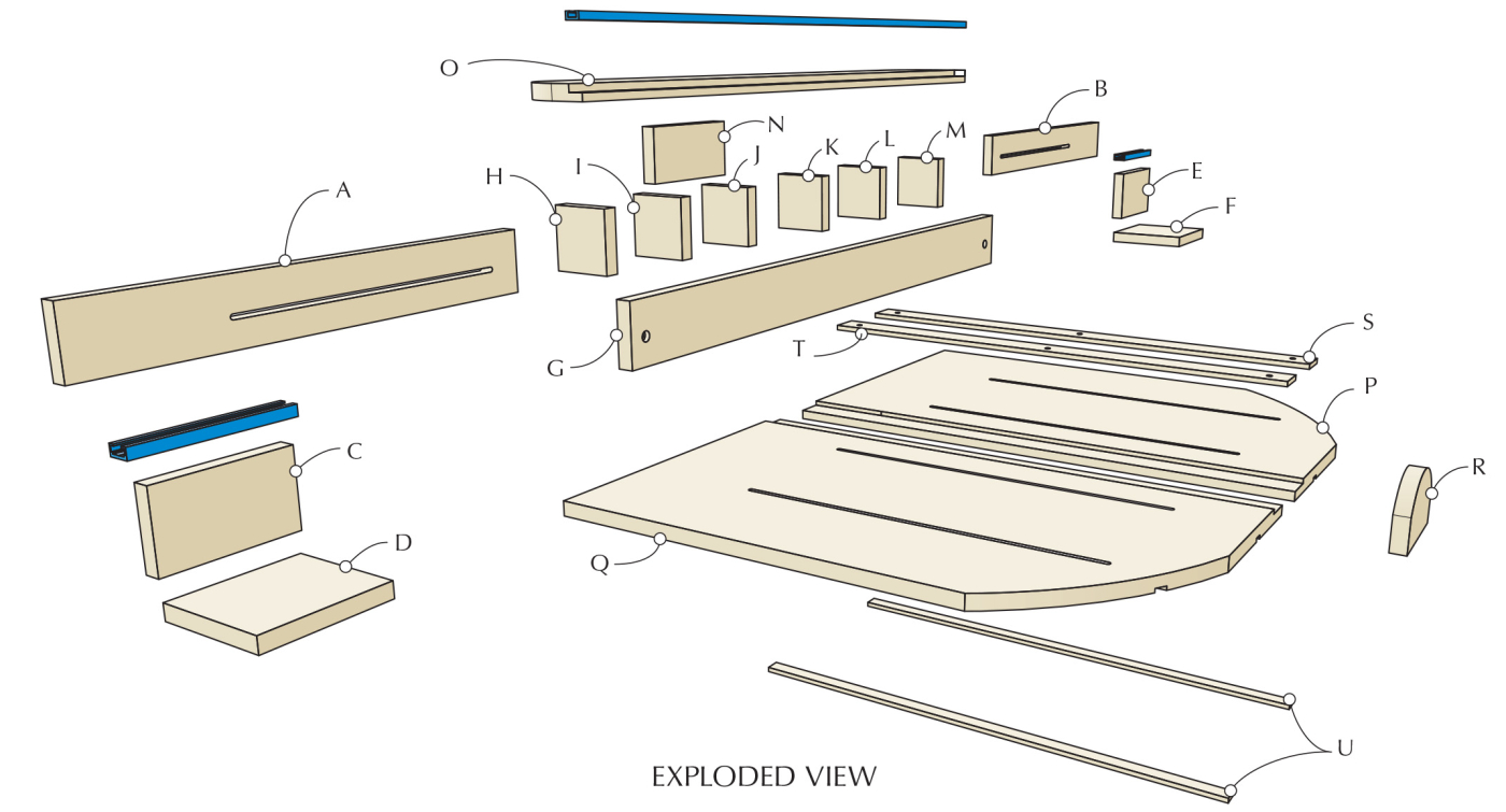 Secure all the blocks to the base panels with glue, taking care that they are perpendicular to the front edge. Brad nails driven from the underside of the base panels will hold the blocks in place as the glue dries, but take care that the two halves remained aligned as you move them around your benchtop. At this point, only the fence guard (N) holds the panels together. You can add more support by attaching the end piece (R) to the far side, centering it over the seam on the back edge between the two base panels.