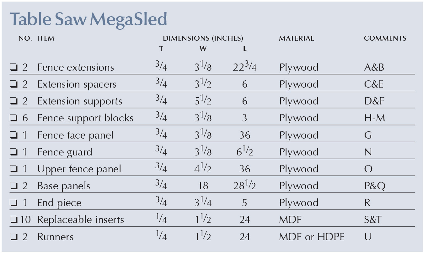 Sometimes I call this one the “MegaSled,” other times the “Super Sled,” because its large size makes it so versatile. In fact, it’s the perfect platform for any number of joinery jig attachments. Since designing the sled I’ve added jigs for cutting miters, splines, tenons, finger joints and dovetails, and I have plans for more jig attachments in the future. It’s all possible because of the sled’s fence design. In fact, you will see several unique and useful features as you build this table saw fixture. In this article, I’ll focus on the sled itself; in the next article, I’ll cover the jigs. Let’s get started!