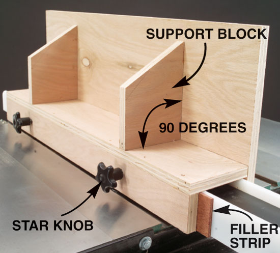I made my tall fence out of 3/4-in. plywood and assembled it with biscuits, glue and finish nails. I made the fence 12-in. tall and a couple inches longer than the depth of my saw table. The support blocks keep the tall fence rigid and at a 90-degree angle to the tablesaw. The bolt ends of the star knobs screw into 5/16-in. threaded inserts. The 1/4-in. filler strip provides a bearing surface for the bolt to tighten against and keeps the bolt from digging into the plastic face of the main fence.
